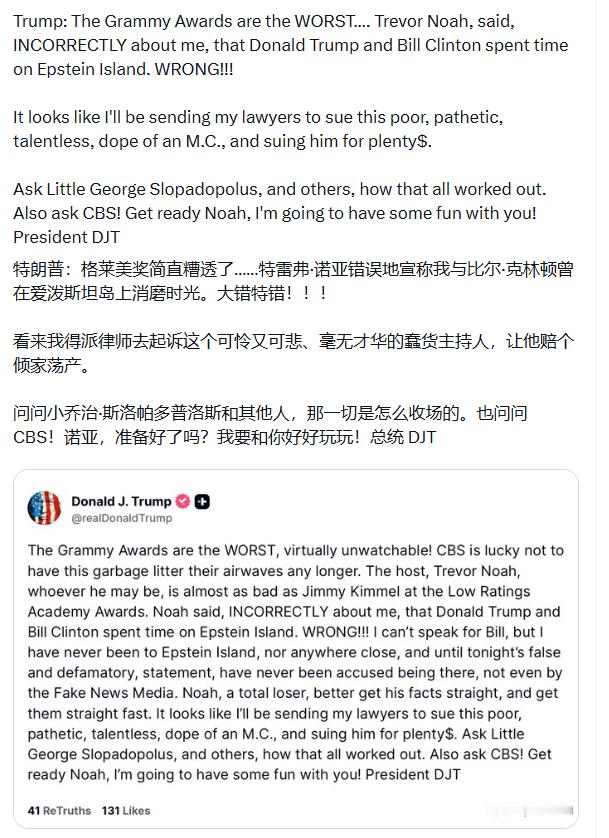 特朗普:“格莱美奖糟透了,简直没法看。主持人Trevor Noah错误地宣称我与比尔·克林顿曾在爱泼斯坦岛上消磨时光。”