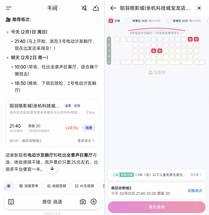 有网友注意到,查询电影票时,已能在千问APP主对话页面购买电影票。记者从千问APP内部人士获悉,AI买电影票功能正在灰测,即将全面上线。