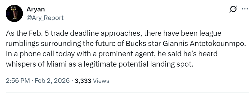 虎扑02月02日讯美国记者Ary社媒发文谈及雄鹿球员扬尼斯-阿德托昆博的交易进展。