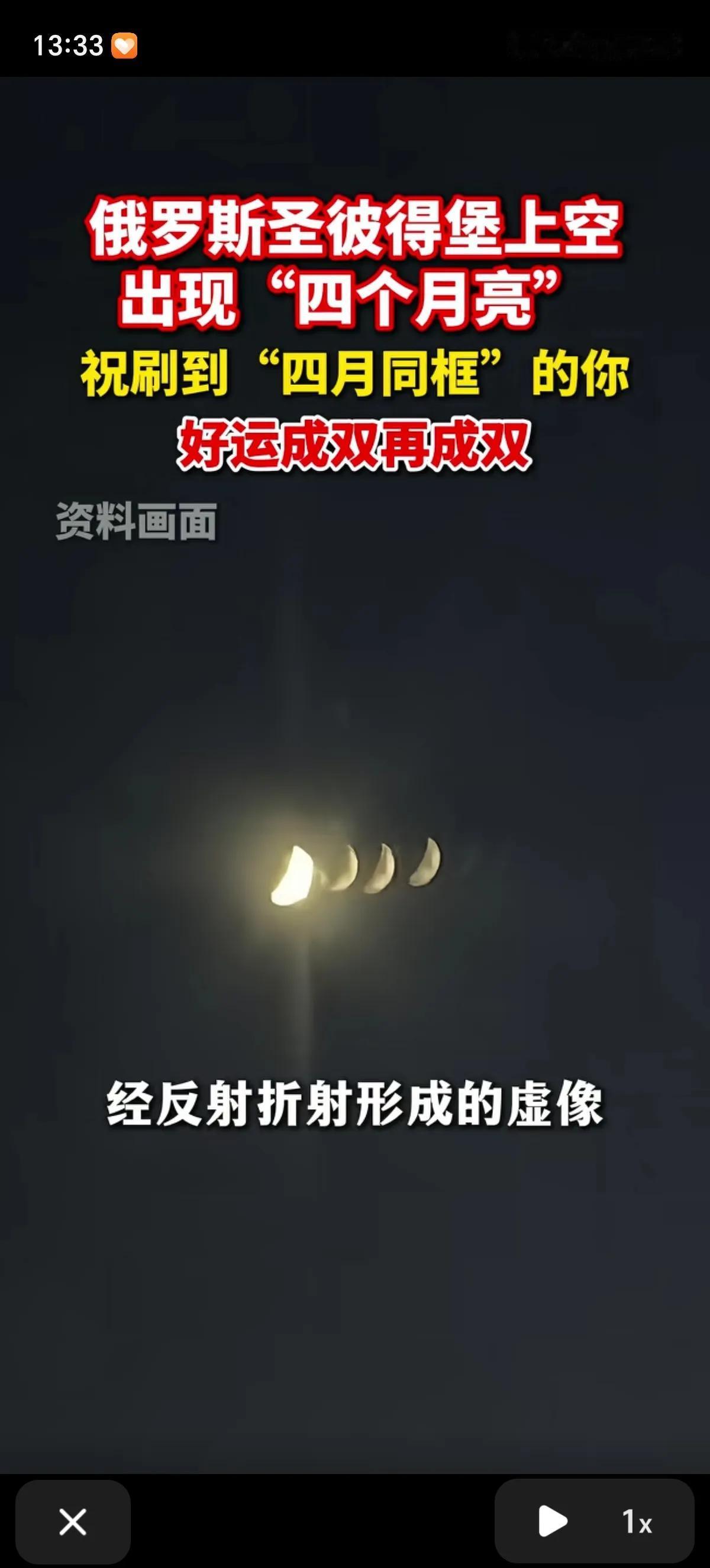 俄罗斯彼得堡上空出现了“四个月亮”的奇景,真是只要活的够久啥都能看见啊!当地的市民抬头就能看见“四月同框”,其实多出来的月亮是假月,也叫“幻月”,并没有真实天体。 它是月光穿过高空冰层时,经反射折射形成的虚像,常会在真月亮附近出现明亮光斑,属于正常的光学现象。 这种现象需要极低的气温(当晚当地气温约-25℃)、高空高湿度,以及冰晶排列异常规则等多重条件同时满足,因此非常罕见。