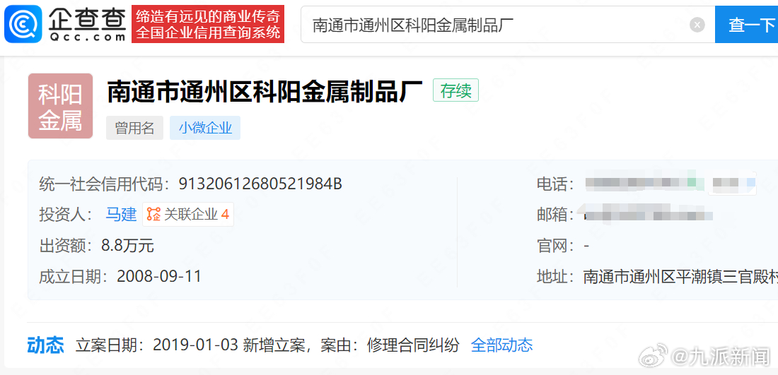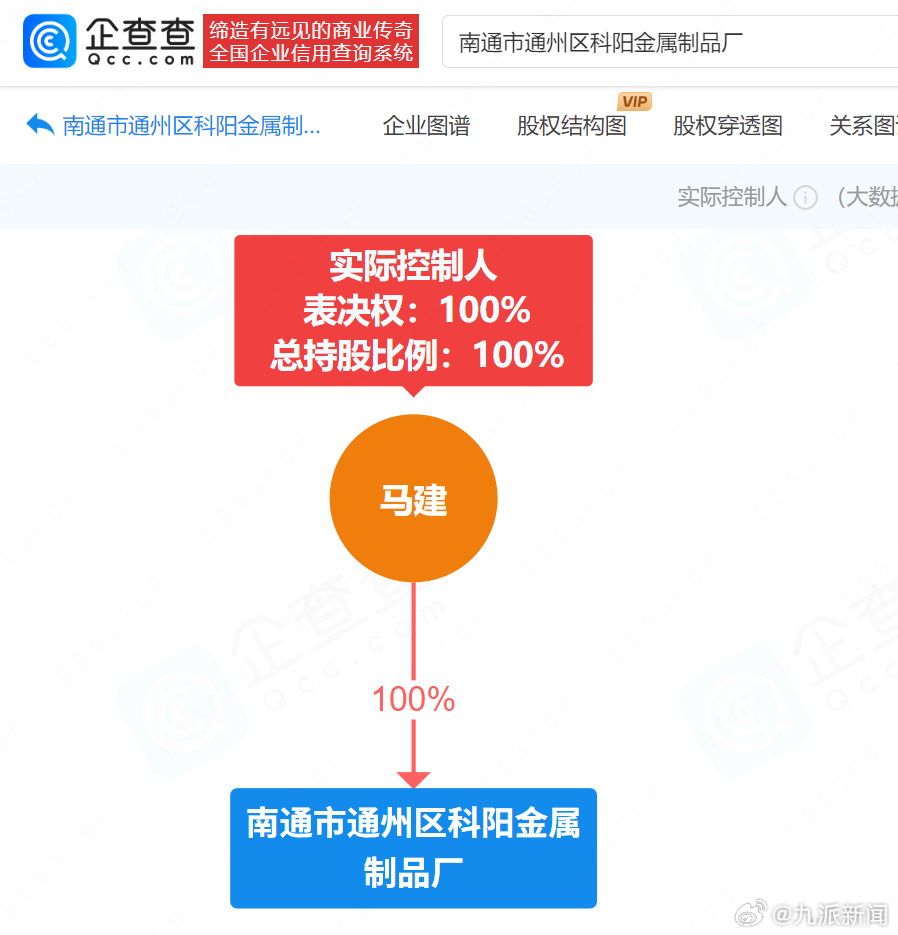 从企查查APP获悉,涉事的南通市通州区科阳金属制品厂成立于2008年9月,出资额8.8万元,经营范围为五金螺丝、光学仪器、金属制品加工、生产、销售,为马建个人独资企业。马建名下共关联4家公司,除该厂外,还有上海巴澜斯国际贸易有限公司、通州市华立金属制品有限公司、通州市华立金属制品有限公司、通州市平潮大众紧固件厂,其中后两家已注吊销。