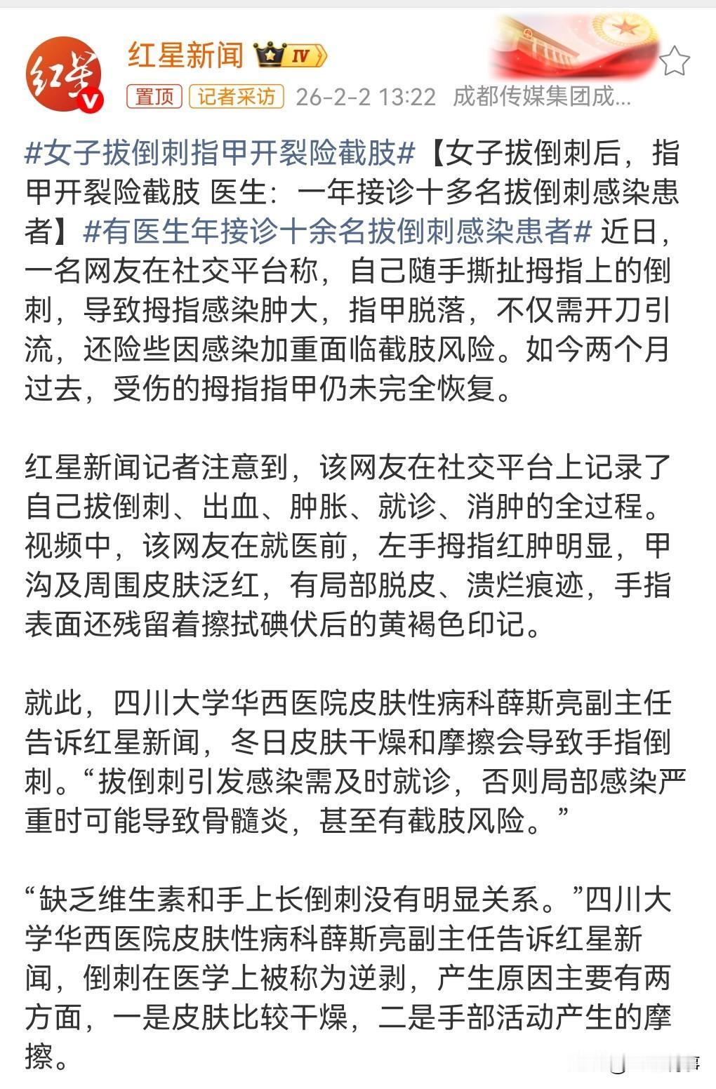 这真是太可怕了,千万不要再拔倒刺了,后果承担不起呀。 近日一网友称,她拔倒刺指甲