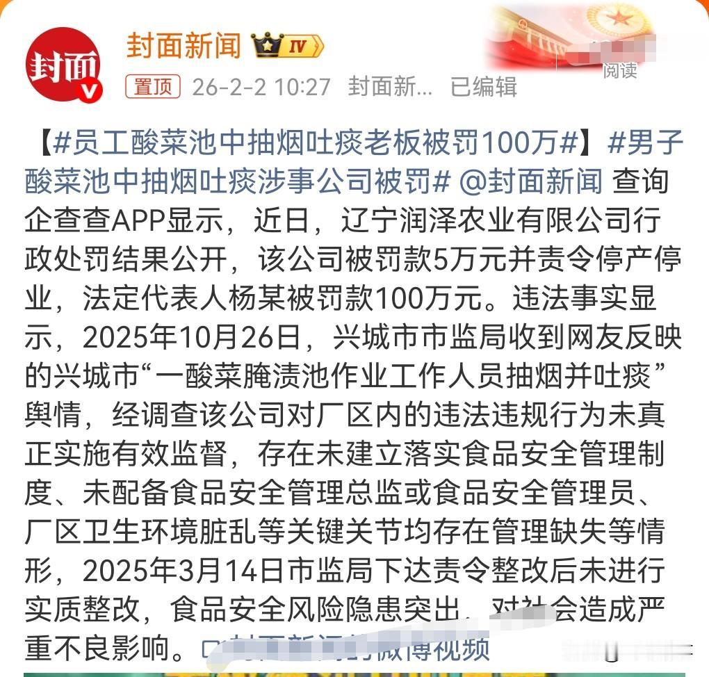 罚的不错,狠狠的罚就对了。 2025年10月,员工酸菜池中抽烟吐痰,这真的是太恶劣了。 怎么能不抽烟吐痰呢?多不卫生啊。 被曝光后,老坛酸菜牛肉面的销量都下降了。 近日处罚结果公开。 员工酸菜池中抽烟吐痰老板被罚100万,罚得好罚的妙。 叫这些人不好好的管理员工,竟然允许这种员工上班,那就必须罚老板了。 搞得跟个草台班子一样,上班还可以抽烟。