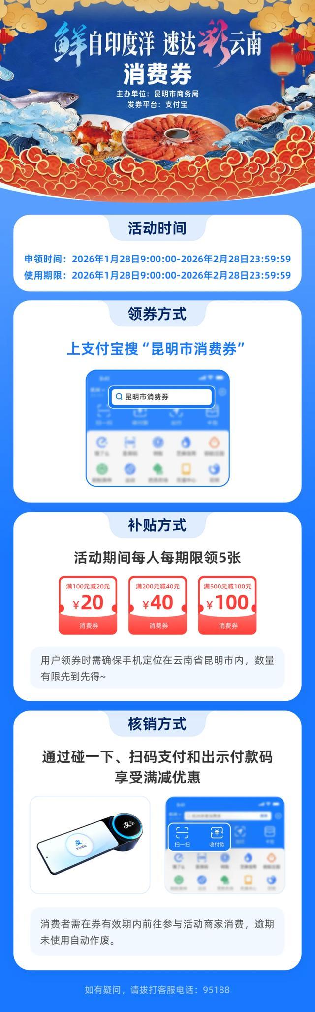 领取方式:通过支付宝平台领取,手机GPS定位在昆明市的个人消费者均可参与。每日限领取1次,单日限核销1张,票券自领取当天内有效(具体以参与商户闭店时间为准),消费券使用/过期后可重新领取。本次活动期间,同一用户最多可领取5次消费券。名额有限,先到先得,用完即止。
