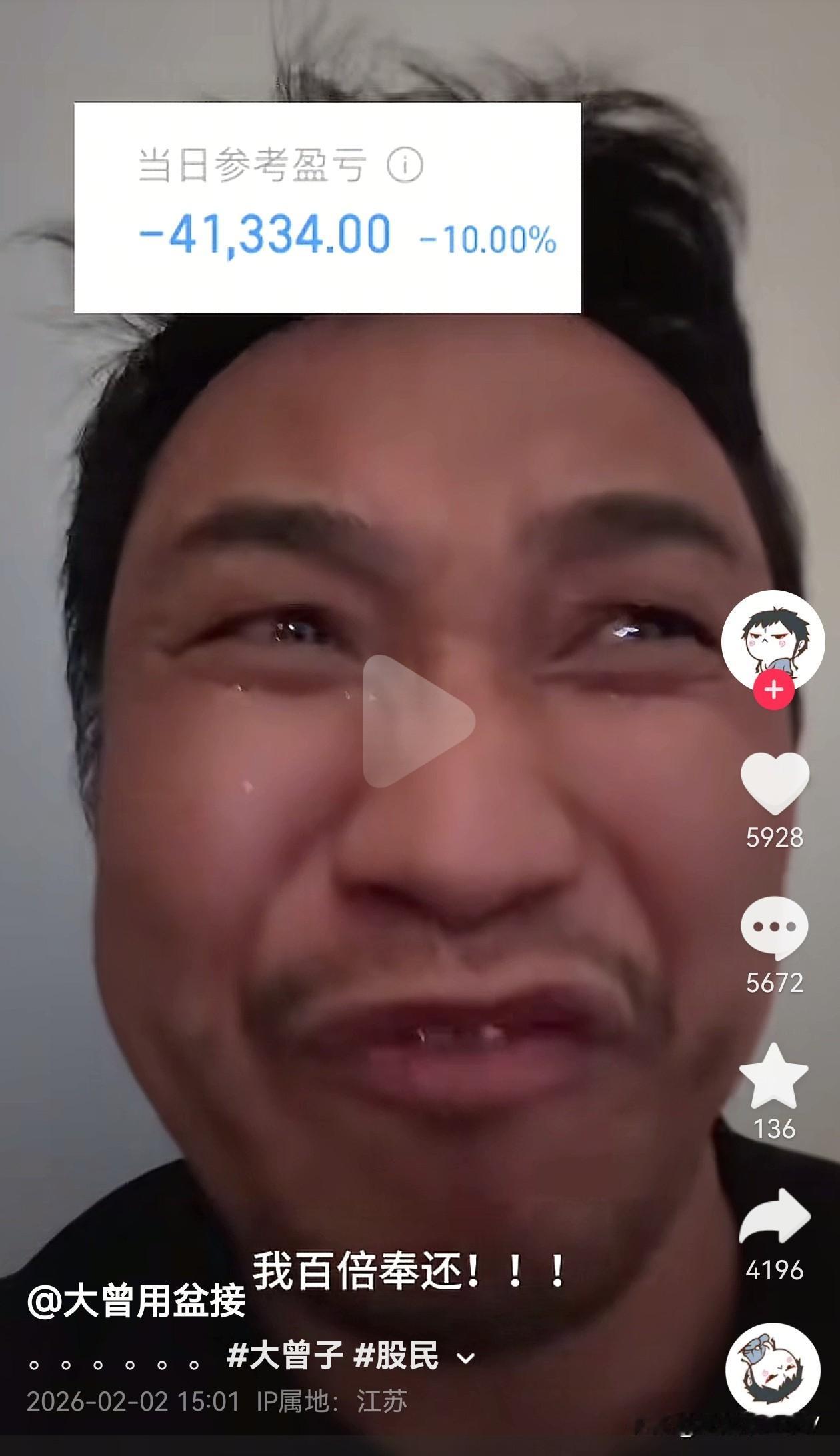 哈哈哈!大曾子太难了,今天又是全仓跌停,继续被计提 4.1 万,他已经亏得没办法了,开始开启付费视频了,关键是他开了还真有人付费看,今天中午十一点多发的视频,到下午收盘时间已经卖了 5000 多份,一份需要 3 块钱,也就是这几个小时他可以赚 7500 元,真是流量大的惊人啊! 保守估计这个付费视频给他带来的收益要超过 1 万元,这下又有钱拿来补仓了,话说花钱看他视频的人是咋想的?学亏损经验的吗?[捂脸]大曾子