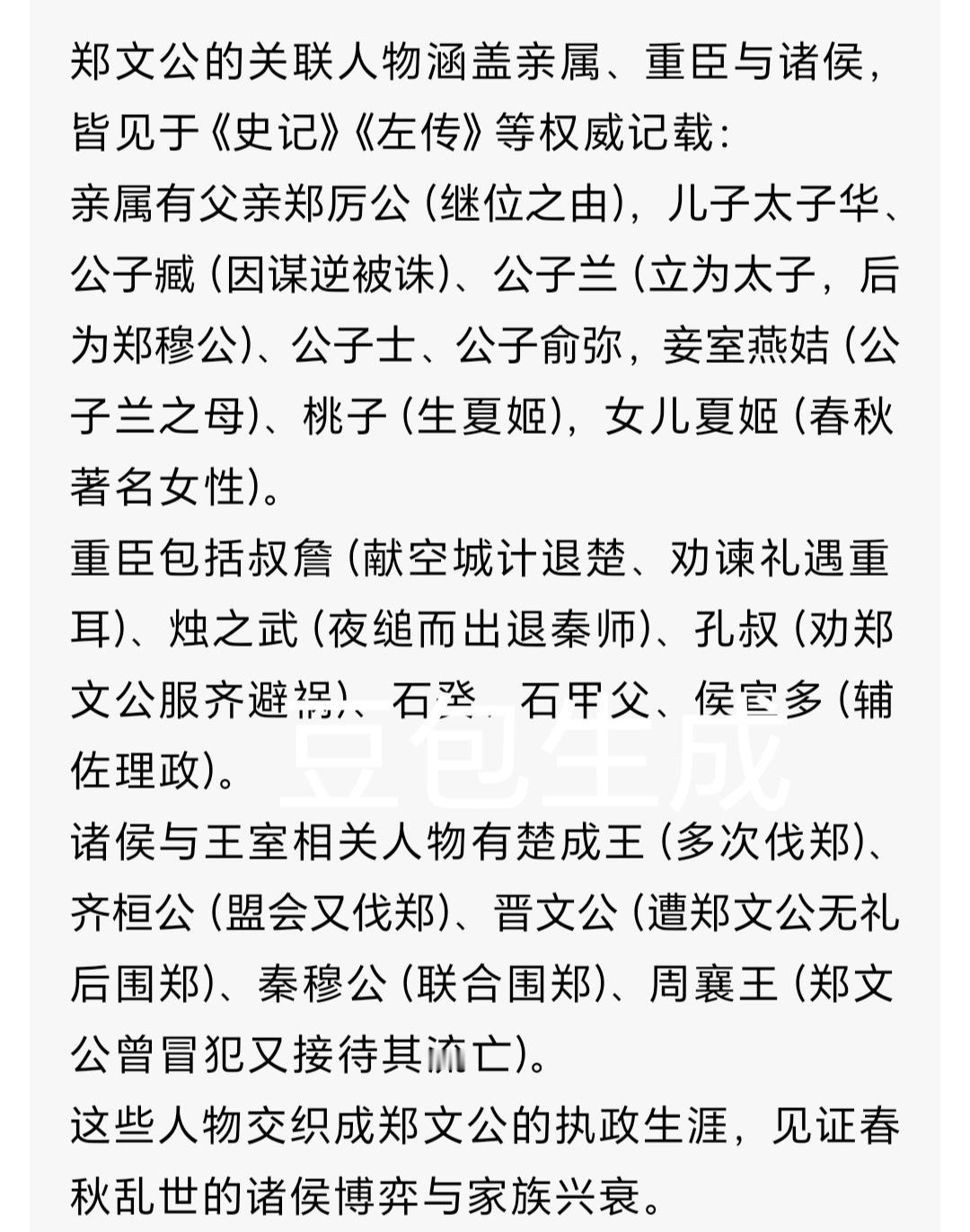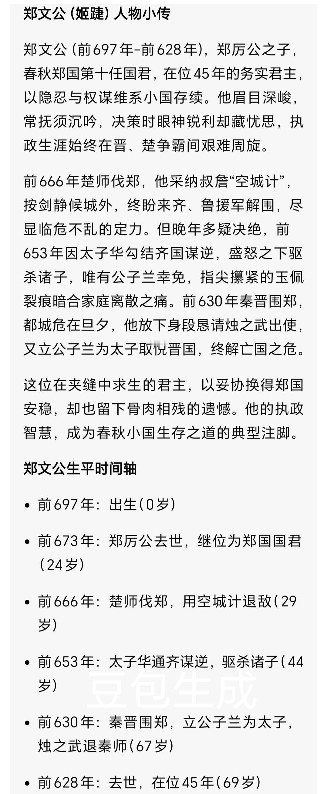 抗周拒晋45年!郑文公凭啥让郑国在晋楚夹缝活下来? 春秋乱世,诸侯或依附霸主或被兼并,郑文公姬踕(jiǎn)却剑走偏锋——顶撞周襄王、拒纳流亡的重耳,在晋楚夹缝中硬撑45年,让郑国疆域稳固、百姓安居。这位被骂“狂妄”的诸侯,藏着乱世小国最硬核的生存智慧。 一、临危即位:30岁接手烂摊子,以稳破局 公元前673年,30岁的郑文公在内乱后仓促即位,彼时郑国早已无郑庄公“小霸”风光,都城残破、国库空虚,宗室涣散,齐楚探子在边境频繁活动。 据《左传》记载,他即位后即刻脱下礼袍巡街,下令三月修复城郭、减免三年赋税,开放王室苑囿让百姓耕种。他在太庙以清水土块与宗室盟誓,以“共守郑国根基”的赤诚安抚人心,没有急着耀武,而是先修内政、安民心。 这份沉稳成了小国生存的基石,短短五年,郑国农田复耕、城防稳固,涣散的人心被务实举措牢牢凝聚,为后续的外交博弈打下基础。 二、外交博弈:不做附庸,硬气背后的精准算计 郑文公最受争议的,是他“不攀附、不示弱”的外交风格,而这份硬气,从不是盲目狂妄,而是精准的实力权衡。 公元前639年,滑国背郑附卫,面对晋国背后撑腰,郑文公果断出兵收复,直言“守不住底线,便会被随意拿捏”。公元前637年,重耳流亡路过郑国,上卿叔詹劝其善待留后路,郑文公却理性判断:晋国内乱未平,重耳前途未卜,厚待只会引火烧身,最终仅送粮闭门,避却无谓之祸。 面对周襄王的施压,他更是不卑不亢,周襄王联合狄人伐郑,他坐镇城楼指挥防御,又游说狄人结盟互利,最终让狄人撤兵,化解王室怒火。郑国地处晋楚争霸要道,依附任何一方都会成眼中钉,唯有中立守底线,才能找到生存空间。 三、夹缝求生:灵活变通,该低头时绝不逞强 郑文公的生存智慧,更在于懂得审时度势、灵活变通,深知小国生存不能一条道走到黑。 公元前632年城濮之战后,晋国大败楚国成新霸主,郑文公立刻派太子兰出使晋国主动示好,有人嘲讽其前后不一,他却坦然回应“郑国的生存,比面子重要”。他派使拜访晋臣,不卑不亢保持诸侯体面,既不攀附也不结怨。 同时他深耕经济,利用郑国交通要道的优势,修驿站、开商贸集市,收取合理关税充实国库,也让晋楚不愿轻易攻打——毕竟郑国是重要商贸通道,动之得不偿失。他始终坚守“不主动挑事”的底线,即便国力恢复,也只守不攻,避开了无数战火。 四、晚年多疑:权力阴影下的坚守与遗憾 随着在位时间渐长,郑文公的多疑性格愈发明显,晚年最大的争议便是诛杀太子华。太子华野心勃勃,私通晋国许诺割城换王位,密信败露后,60多岁的郑文公不顾群臣求情,坚决下了诛杀令。 他直言“背叛国家者不可恕,今日纵容,明日便有更多人效仿,郑国将永无宁日”。此后他又废除几位有不轨之心的公子,立幼子兰为太子。这份狠辣让他背负“无情”骂名,可在乱世中,王室内部的背叛远比外敌致命,他的选择,终究是为了守护郑国的稳定。 公元前628年,75岁的郑文公病逝,在位45年,他虽未成为称霸的枭雄,却用“稳内政、巧外交、知变通”的智慧,让郑国在乱世中安然存续,写下了小国生存的经典范本。他的硬气不是狂妄,变通不是妥协,多疑不是天性,而是乱世君主的必然选择。 你觉得郑文公的这份生存智慧放在当下依然适用吗?如果他当年善待重耳,郑国的命运会迎来转机吗?评论区聊聊你的看法~东周列国志 周襄王的诸侯
