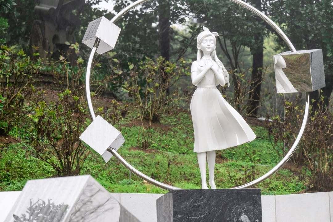 「这是一座为熙媛而存在的宇宙。她的丈夫具俊晔以雕塑为她留下一条不会终止的轨道,让思念持续运行。九个立方体如行星般围绕着熙媛——它们既是Koo最核心的创作符号,也是一段被长久支持、温柔守望的艺术人生。「九」在韩语中与「Koo」同音,是熙媛最珍爱的数字,亦是两人之间无可取代的密语。她所凝视的南方208度,连结着台北、家人与爱的所在;同时也标记了2月8日:一个使爱情完成并延伸至永恒的日子。在这条轨道上,时间不再终结,爱仍持续运转。2026.2.2」大S雕像