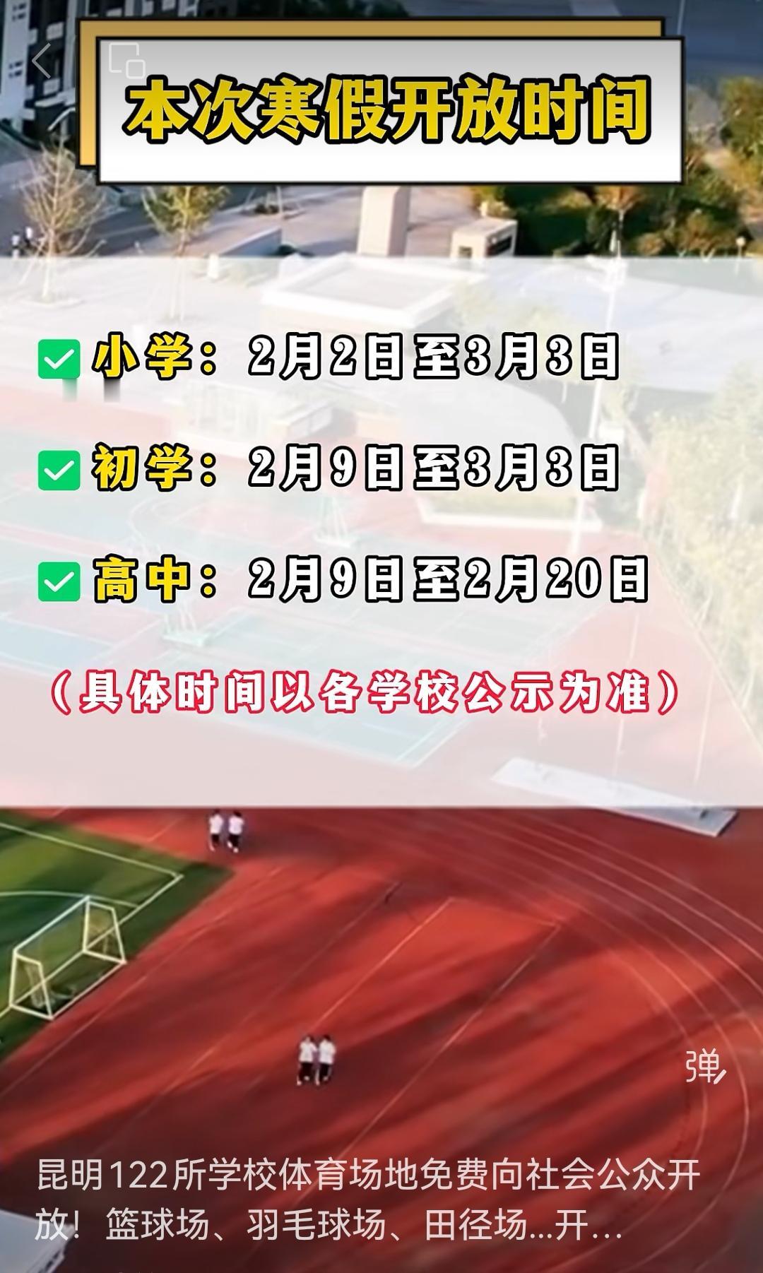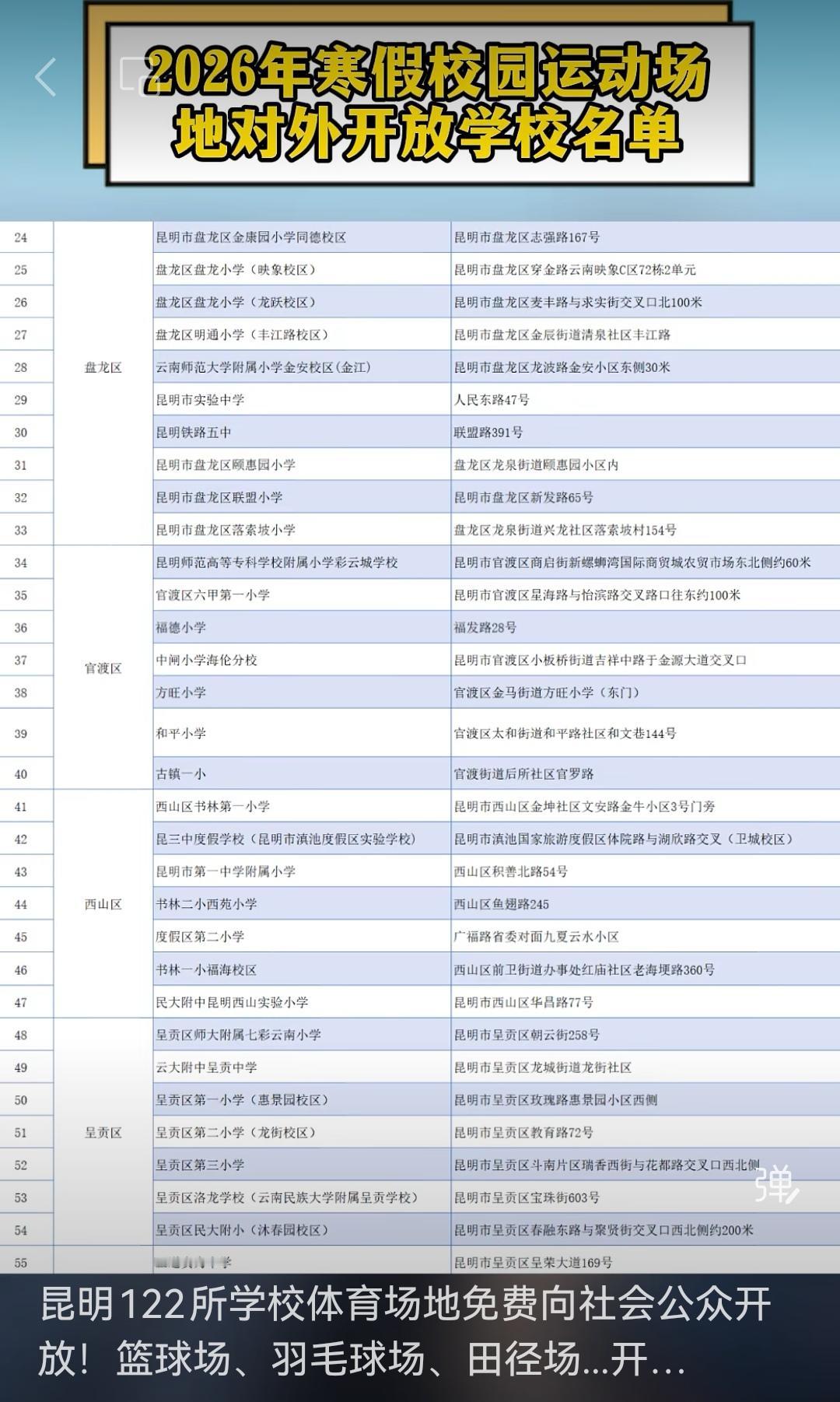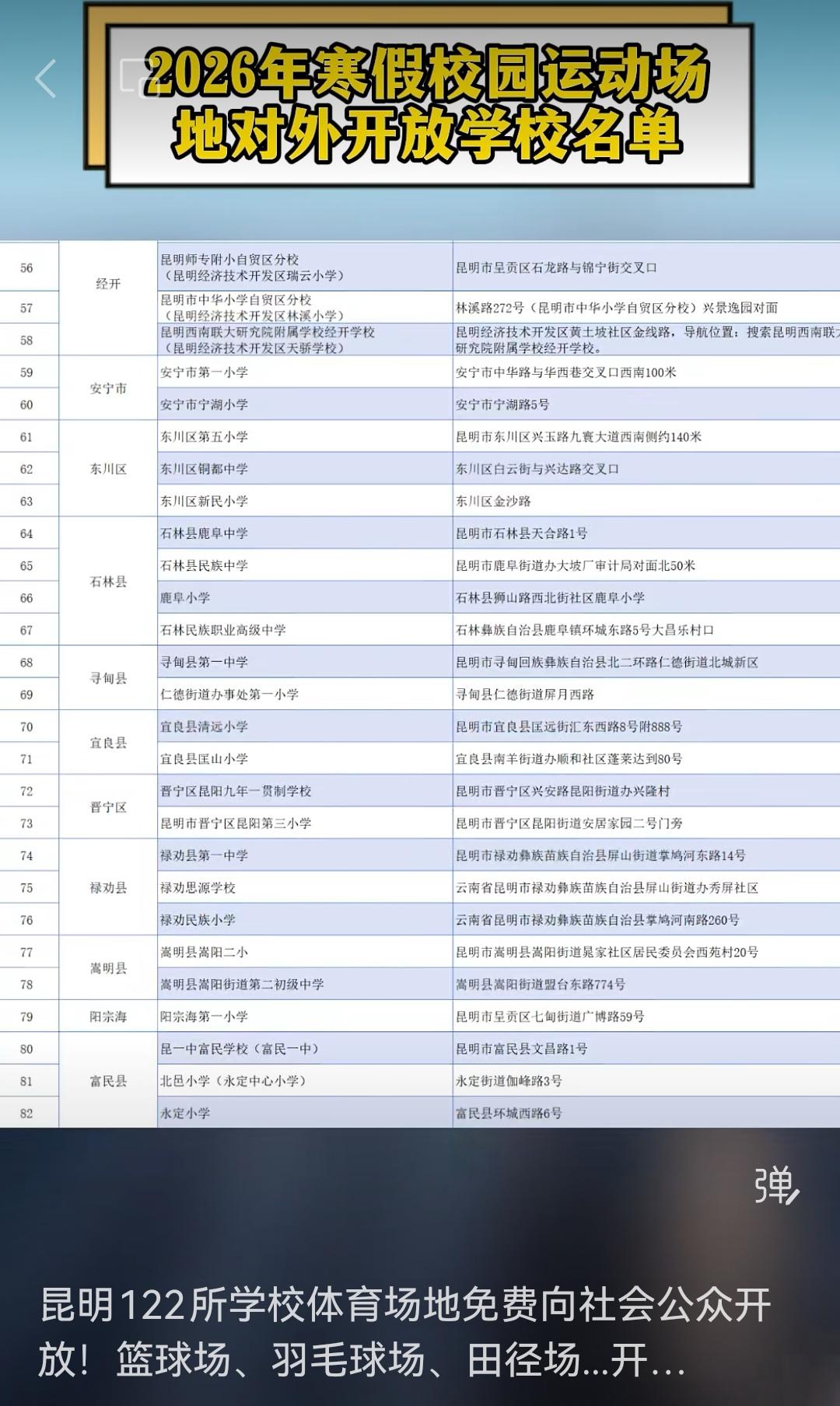 昆明这波操作太赞了!122所学校体育场地免费向社会公众开放,这下咱运动的地儿更多了!像篮球场、羽毛球场、田径场等,应有尽有。 之前就有82所学校开放,涵盖了五华、盘龙等各个区,开放时间多在工作日放学后、周末和节假日。市民通过“昆明体育”微信公众号就能免费预约,还能查看详细信息,全程线上操作,刷脸入校。2024年首批40所试点开放,暑假预约人数达1.3万。现在学校数量增加,能让更多人享受运动乐趣,期待大家都能在这些场地活力满满! 昆明运动场地 昆明足球训练场 体育场 免费免费足球场地 云南体育公园 昆明体育公园 昆明跑步场地