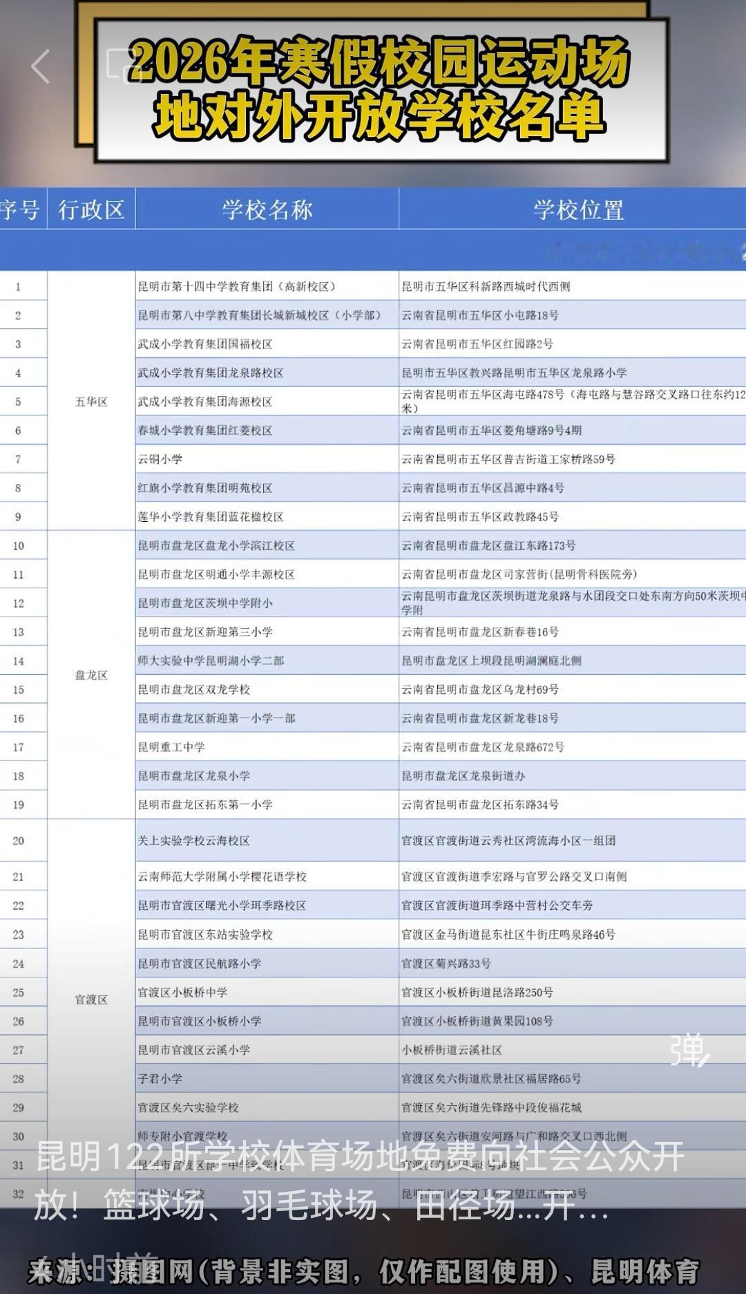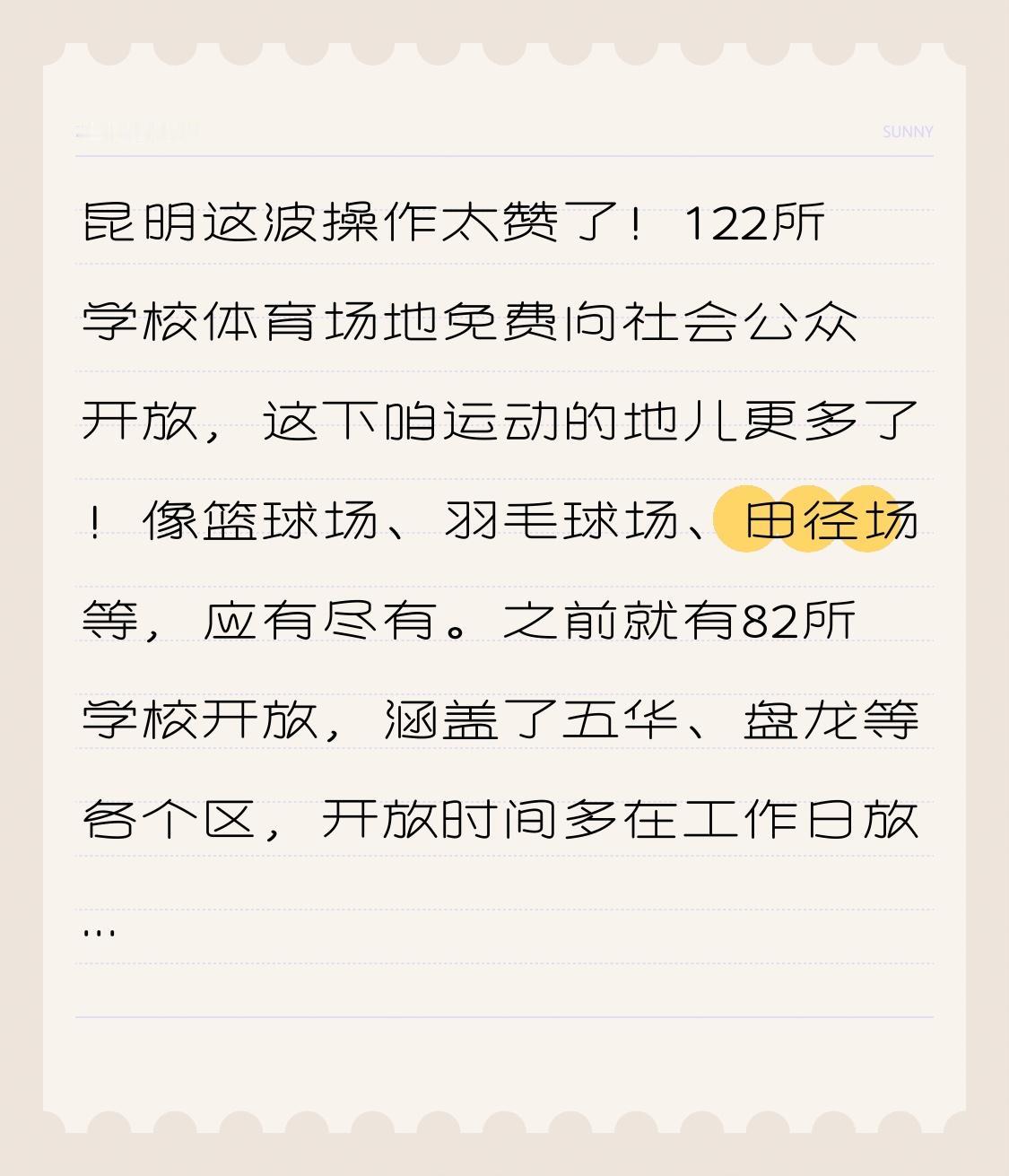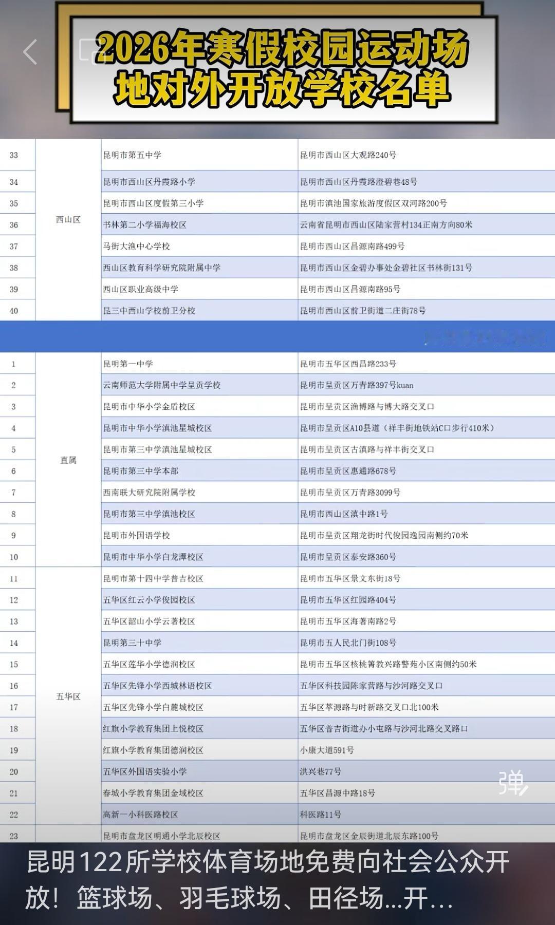昆明这波操作太赞了!122所学校体育场地免费向社会公众开放,这下咱运动的地儿更多了!像篮球场、羽毛球场、田径场等,应有尽有。 之前就有82所学校开放,涵盖了五华、盘龙等各个区,开放时间多在工作日放学后、周末和节假日。市民通过“昆明体育”微信公众号就能免费预约,还能查看详细信息,全程线上操作,刷脸入校。2024年首批40所试点开放,暑假预约人数达1.3万。现在学校数量增加,能让更多人享受运动乐趣,期待大家都能在这些场地活力满满! 昆明运动场地 昆明足球训练场 体育场 免费免费足球场地 云南体育公园 昆明体育公园 昆明跑步场地