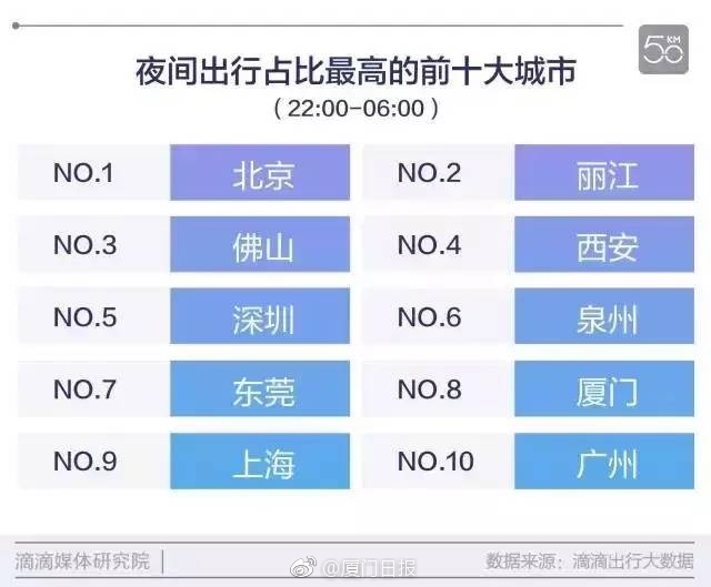 厦门新闻【夜间出行前十大城市 厦门排第八】日前,滴滴媒体研究院发布了全国400城的出行数据,其中厦门强势入围夜间出行(22:00-次日6:00)占比最高的前十