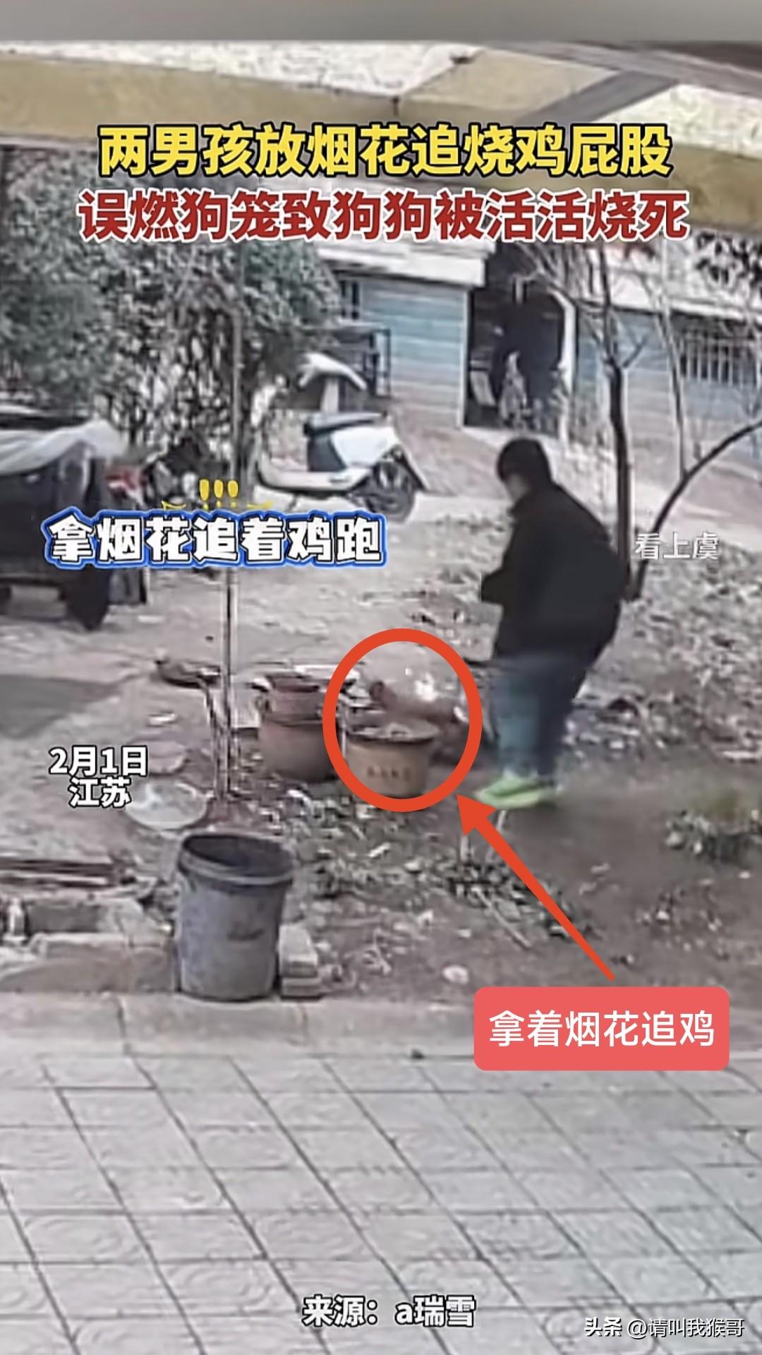 如果做不到保护动物,起码不应该去故意伤害。近日江苏某小区里两个孩子玩烟花嬉闹追着烧鸡屁股,过程中却不小心引燃了旁边搭设的狗笼,虽然期间也有过救援行为,但最终因火势过大将笼中的狗烧死。 事后警方介入处理,在物业的协助下找到孩子的家长,调解之下两孩子家长赔礼道歉,并对其进行批评教育。 网友觉得简单的批评教育对这两个小孩根本起不到警示作用,就算狗棚没着火,用烟花驱赶鸡也是一种病态心理,用烟花的火烧鸡这种行为本身就是对生命的一种漠视,你们觉得呢?