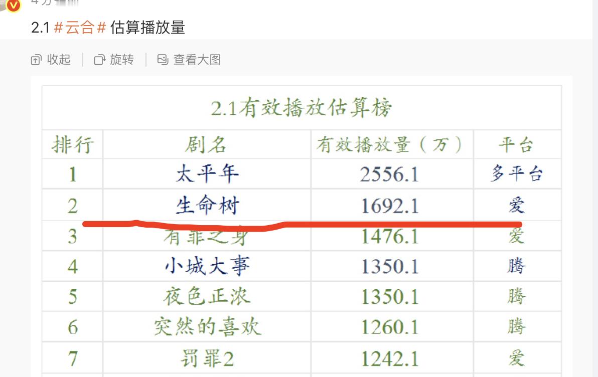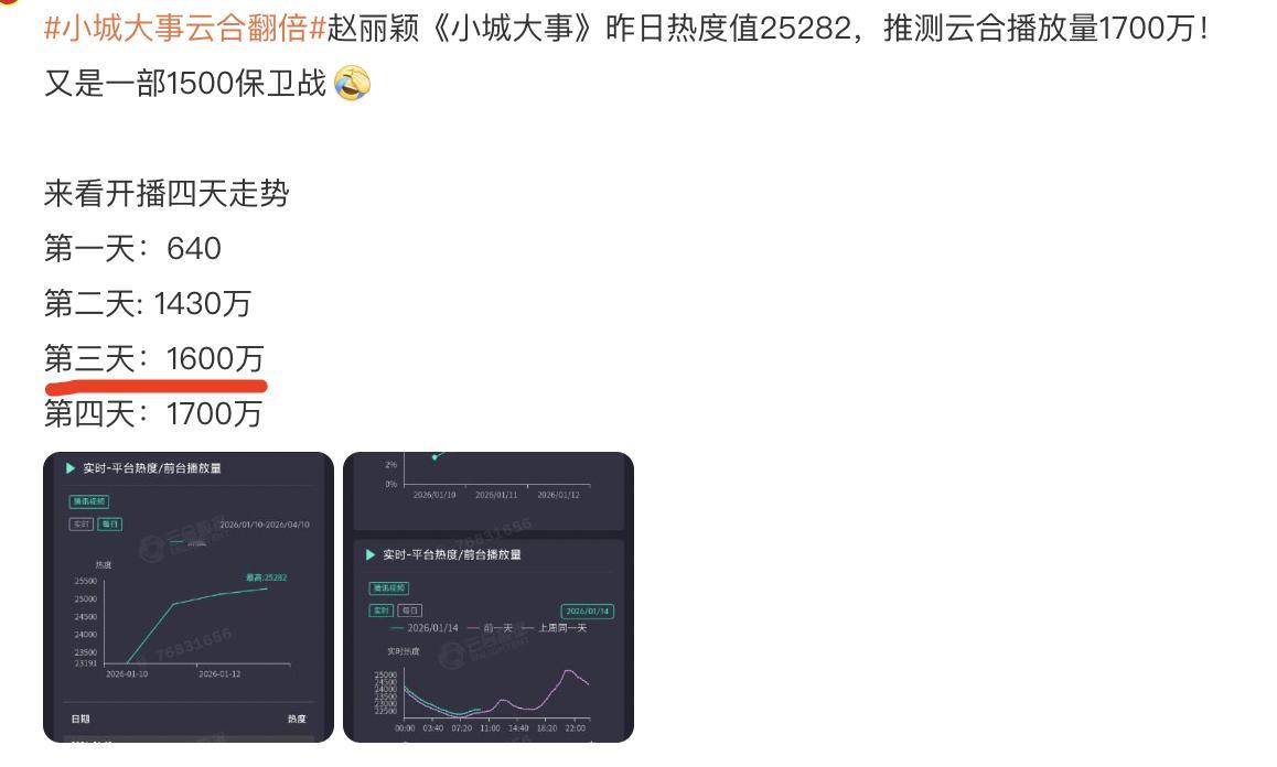 杨紫胡歌《生命树》第三日云合1700万左右对比赵丽颖黄晓明《小城大事》第三日云合1600万杨幂欧豪《生万物》第三日云合5300万+