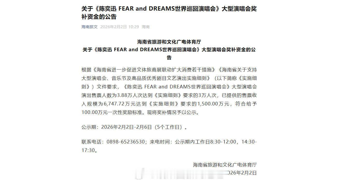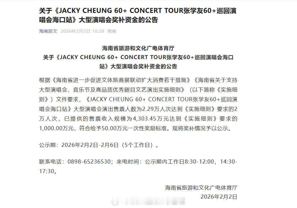「陈奕迅 ()海南開演唱會獲百萬獎金..張學友五十萬 … 《香港大公報》迅:據微信公眾號海南旅文 2月2日消息,海南省 旅遊和文化廣電體育廳發布關於大型演唱會獎補資金的公告。公告顯示,张学友 及陳奕迅在海口的巡迴演唱會,因售票人數及收入規模均達到相關政策要求,擬獲政府專項資金獎勵。根據《海南省進一步促進文體旅商展聯動擴大消費若干措施》、《海南省關於支持大型演唱會、音樂節及高品質優秀劇目文藝演出實施細則》(以下簡稱《實施細則》)文件要求,《JACKY CHEUNG 60+ CONCERT TOUR張學友60+巡迴演唱會海口站 》大型演唱會演出售票人數為2.29萬人次達到《實施細則》要求的2萬人次,已提供的售票收入規模為4,303.45萬元達到《實施細則》要求的1,000.00萬元,符合給予50.00萬元一次性獎勵標準。現將獎補情況予以公示..」入內看全文:网页链接 即时娱乐新闻 娱乐圈 音乐 乐坛 ..….. 香港