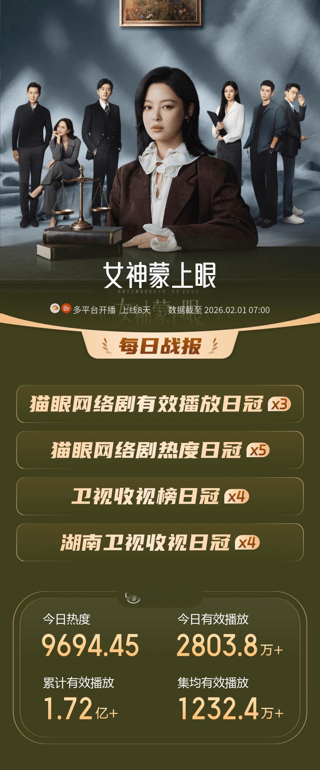 女神蒙上眼有效律政剧 芒果台这波赢麻了!《女神蒙上眼》收视口碑双爆,7天日冠在手,案件敢拍有深度,猥亵案罗生门、家暴案反击直击社会痛点。辛芷蕾林雨申棋逢对手,专业交锋间藏温柔,实力派演绎让法理与人性的碰撞超有看点,国产律政剧天花板!女神蒙上眼