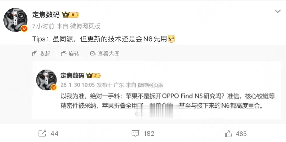 与此同时,数码博主“定焦数码”爆料称,苹果在自研折叠屏设备过程中,曾对OPPOFindN5的核心铰链及精密组件方案进行研究参考,并提到“更新的技术会由N6率先应用”。这一信息被业内解读为OPPO在折叠屏核心结构设计上的行业标杆地位。