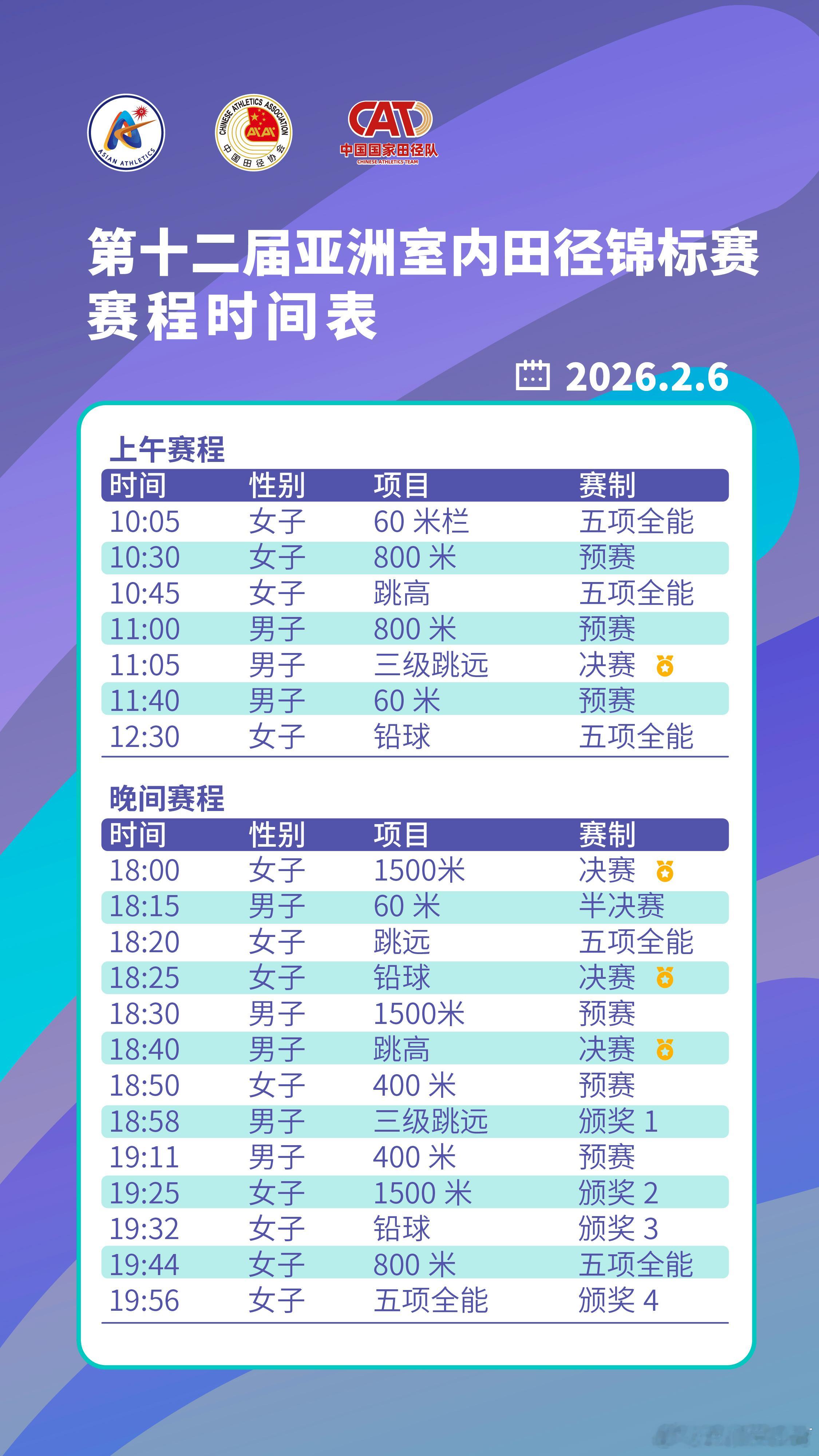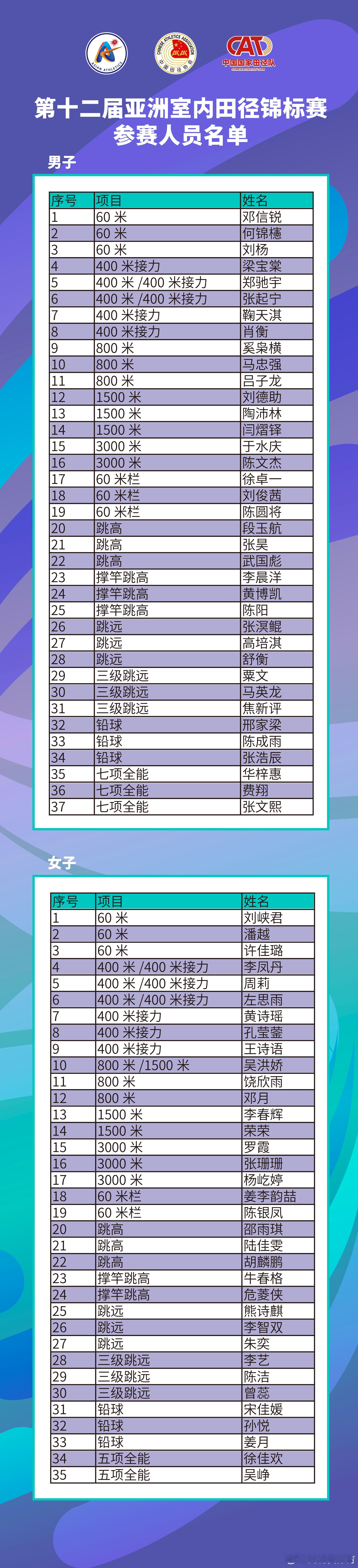 亚洲室内田径锦标赛 中国队参赛名单及每日赛程。图片来自中国田径协会。
