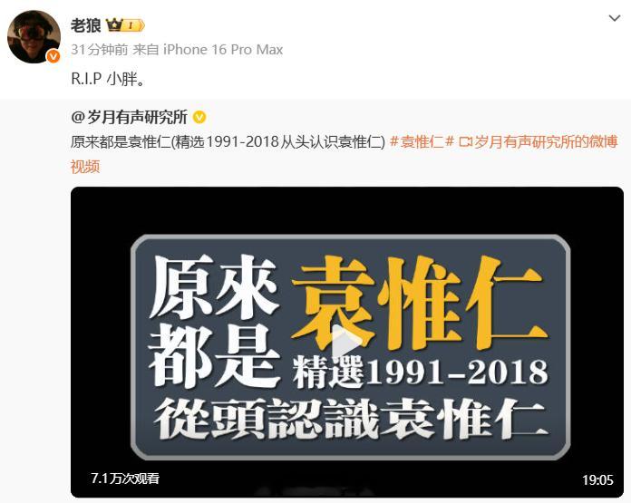 群星悼念袁惟仁 2月2日,袁惟仁去世,群星悼念老狼悼念:“R.I.P 小胖。”张