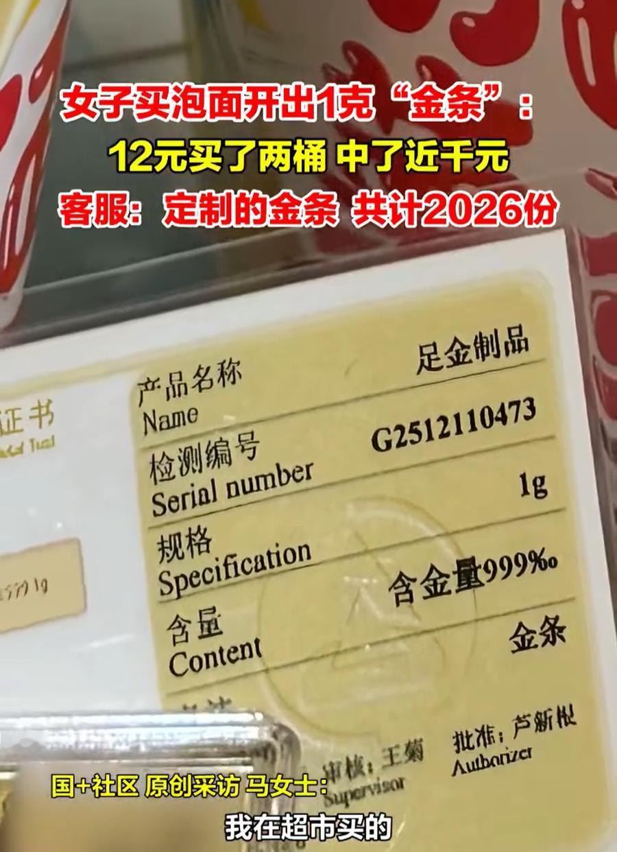 白象方便面里真藏了金条, 12块钱买一桶面就中了, 谁还信这是套路? 那天在开封火车站旁边那家生鲜超市,马姐和闺蜜花12块买了两桶白象金汤肥牛面。 掀开铝箔那一下,真金光一闪——1克小金条,上面刻着“白象”,不是贴纸,不是镀层,是能过火的真货。 活动从2025年12月20号开始,到2026年3月31号结束。 总共就2026份金条,不按销量发,也不搞抽奖页面,就硬塞进桶面夹层里。 有人称重找“最重桶”,结果称出三根叉子也没中;有人拍视频发抖音,一条就7.4万赞。 马姐打算卖,按市价能换五百多;姚姐留着,说放家里图个吉利;还有人拿金属探测仪扫货架,搞得像拆弹。 客服说“别用科技”,不是装,是这事儿真没法算概率——产线动、库存调、桶桶不同,你猜不中。 截至2月1号,公开中奖的才几个。 真金是真金,但不是发福利,是碰巧。 一克,520块,够吃四十几顿面。 可它躺在面桶里,比泡面汤还烫手。 我昨天也买了桶。没中。