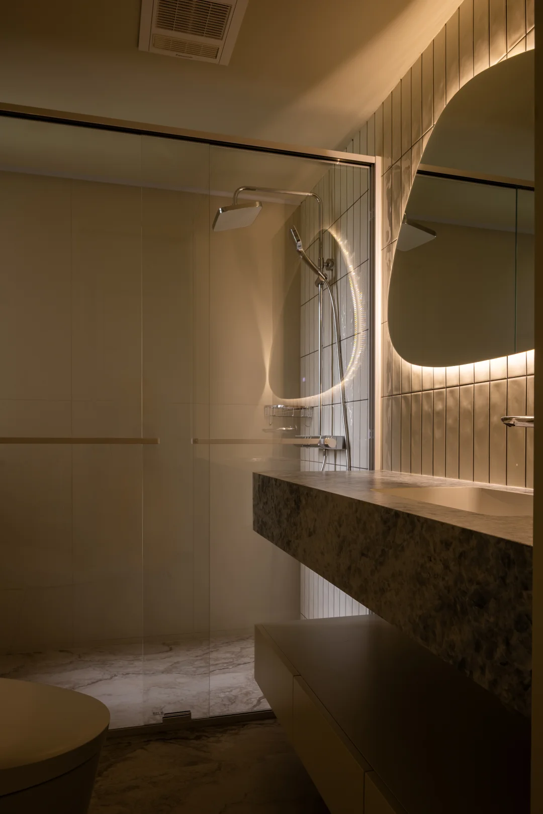 枫丹白露老房翻新🔚 石材自带光泽肌理,与哑光墙砖形成层次,无需过多装饰,空间自然显高级 镜柜内嵌柔和灯光,兼顾收纳与氛围照明,早晚使用都舒适 -
