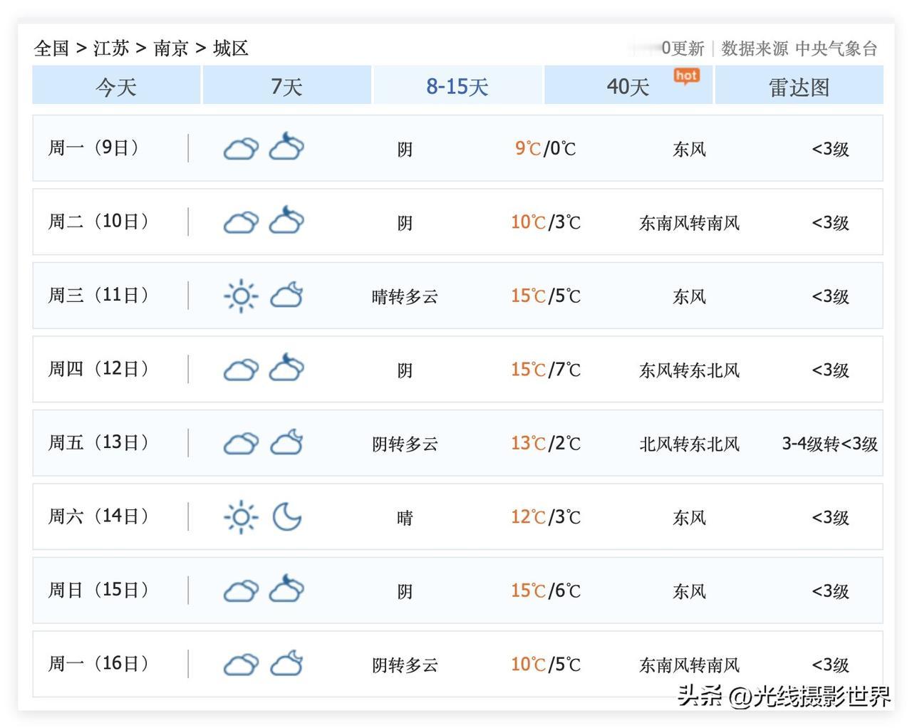 这谁受得了啊?!江苏省南京市,忽冷忽热啊!2月4日和5日,南京最高气温17度,非常非常温暖!但是,2月6日,南京市雨夹雪,气温暴跌至零下2度……我的个天啊!这么剧烈的升温和降温,这么刺激的过山车天气……对于老年人,真的是太难了!大家要有心理准备啊! 大回暖,大降温……好在,毕竟是2月中旬快到了……冷空气……蹦跶不了多久! 好消息是,2月8日到16日,南京市,几乎不下雨,气温回暖……非常适合自驾游……非常适合旅游……长途自驾返乡回家过年……也适合反向过年! 江苏省南京市,2月16日,除夕夜当天,阴转多云,气温5-10度,不错不错。