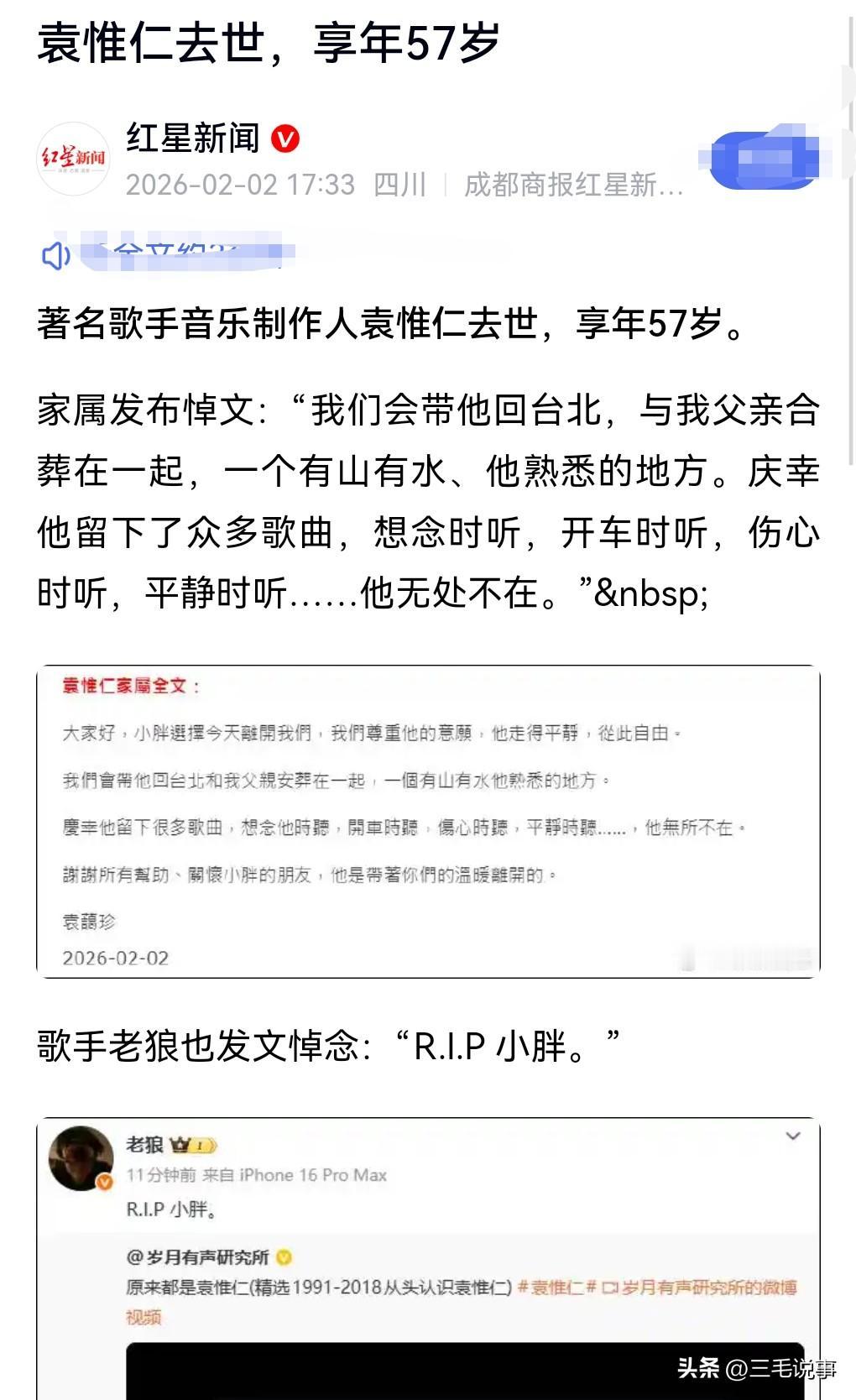 这真是太可惜了,2月2日热搜,知名音乐人袁惟仁去世。 享年57岁。 以前经常在电视上看到他,没想到几年前突然摔倒了。 那英的《征服》就是他的作品,能够写出这样的作品,那确实是很有音乐才华。 想不到熬了这么多年,这次没有熬过去。 人生真的是太无常了。