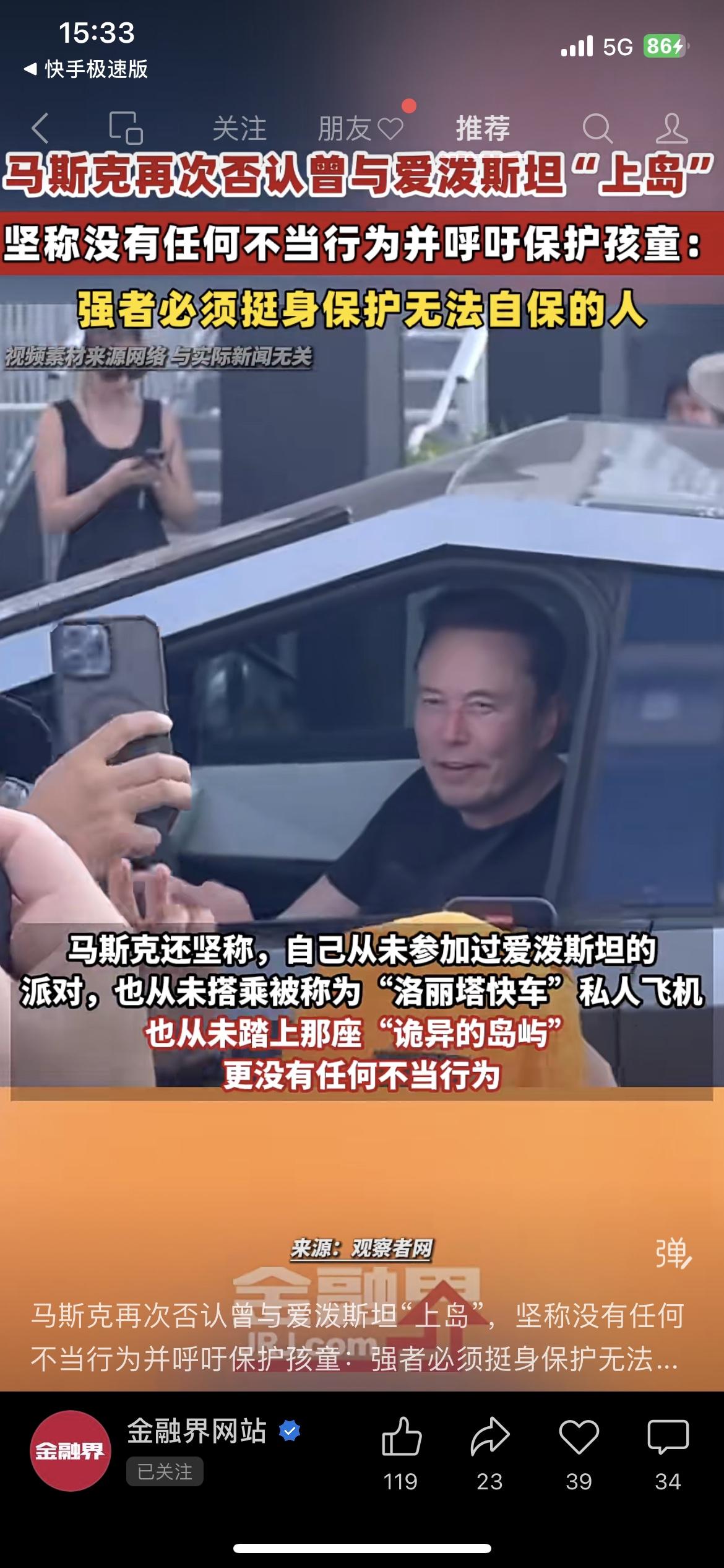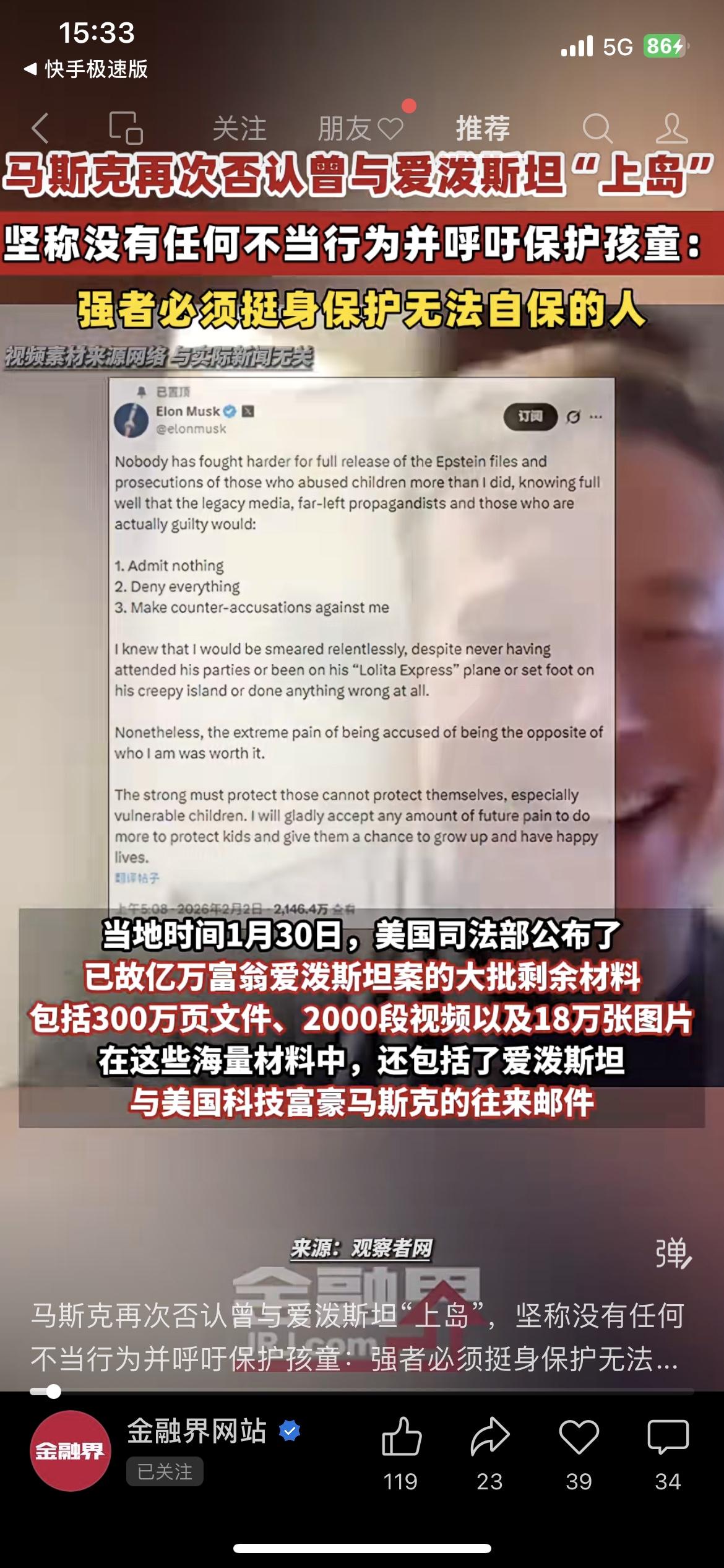 爱泼斯坦案爆新料!厨房视频流出,马斯克紧急发博喊冤 美国司法部公开300万页涉案文件,连细节照片都层层打码,网友吐槽保密比FBI还严;马斯克连夜发文否认上岛,直言自己只是想保护孩子,全程无实锤证据。 大佬的瓜越吃越迷,普通人看看热闹就好。 你觉得马斯克是被冤枉的,还是另有隐情? 爱泼斯坦案 马斯克
