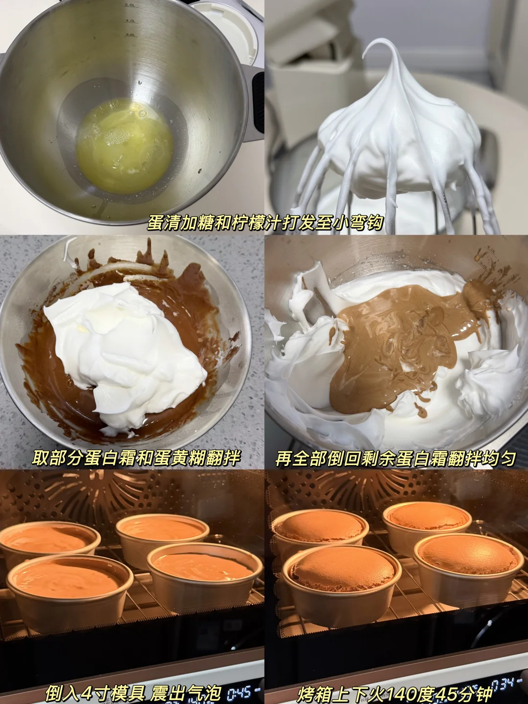 这个配方做出来的4寸可可戚风组织细腻 不塌陷,不回缩,口感软绵 吃一口就深深爱上它 💕4个4寸:鸡蛋4个(55-60克左右一个),玉米油50克,牛奶60克,低筋粉75克,糖50克,柠檬汁6克。 准备工作:先将蛋清和蛋黄分离,蛋清送入冰箱冷冻,这里注意蛋清盆一定是无水无油哦。 1.玉米油加热到70-80倒入可可粉中搅拌均匀,加入牛奶搅拌均匀。 2.筛入低筋粉搅拌无干粉,再加入蛋黄搅拌均匀。(不要过度搅拌) 3.这时候烤箱140度预热,冷冻的蛋清加入糖和柠檬汁,先高速打发,出现纹路转中速再低速,中途用刮刀把边缘打不到蛋白整理一下,确保每个地方都打到哦,时不时把蛋头提起观察蛋白情况,直到出现直立小尖角就好了,打发好的蛋白是有光泽的,倒扣不洒。 4.取三分之一蛋白霜与蛋黄糊混合,手法是翻拌!再倒回剩余的蛋白霜里面,继续翻拌均匀,高处倒入模具,用牙签搅一下除去大气泡,震几下送入烤箱,烤箱上下火140度45分钟,出炉后震几下,倒扣,这点很重要哦,直至晾凉再脱模,不要着急脱模。 希望姐妹们都能做出满意的戚风,评判一个戚风的好坏并不是是否开裂,只要里面的内部组织成功那就可以啦~