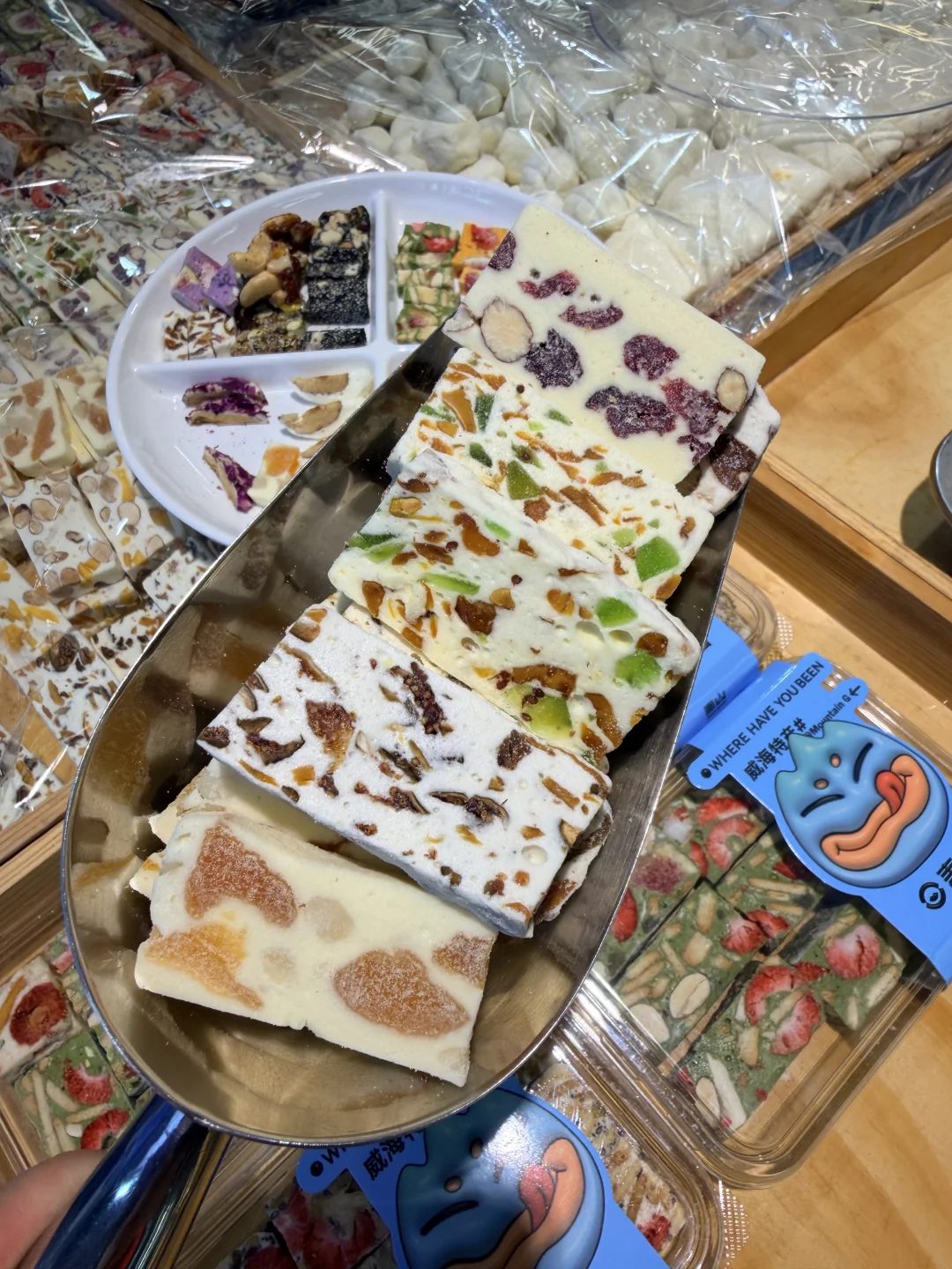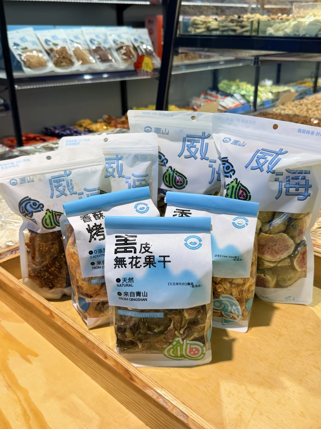 店里进门以后每一样都随意试吃,老板和店员都很热情!除了威海特产还有坚果、果干、海鲜小零食很多好吃的!店内还有文创区,真的值得去逛!