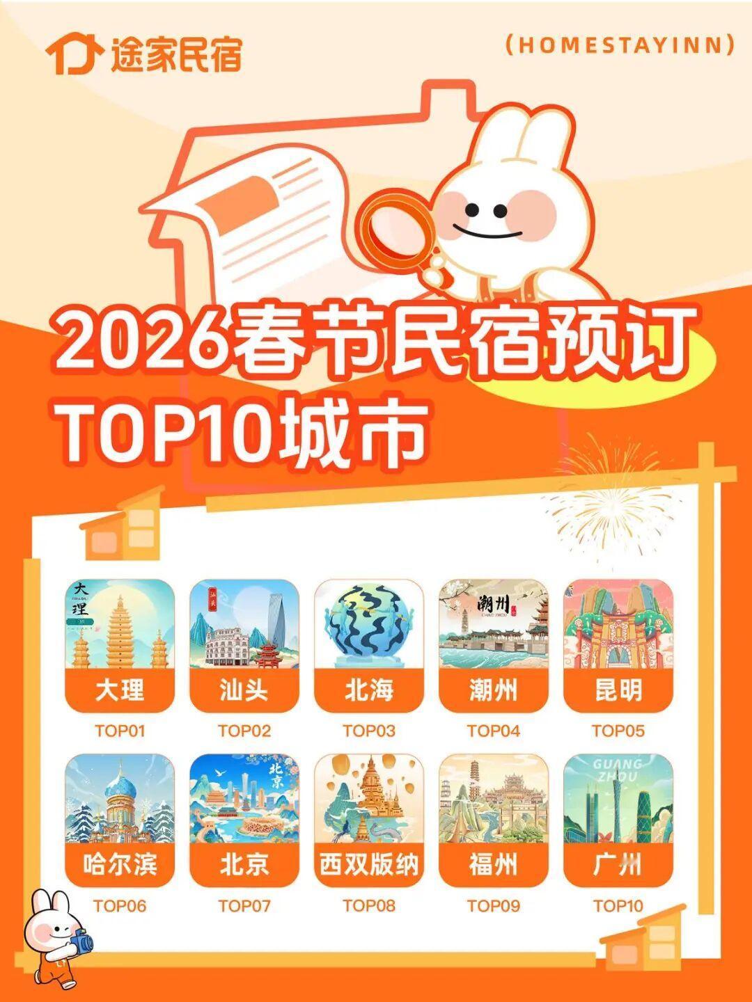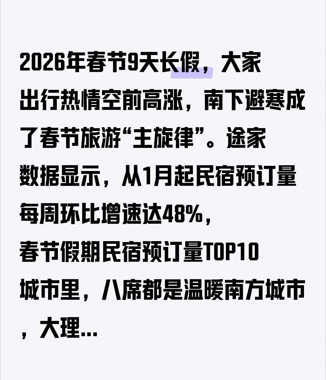 2026年春节9天长假,大家出行热情空前高涨,南下避寒成了春节旅游“主旋律”。 途家数据显示,从1月起民宿预订量每周环比增速达48%,春节假期民宿预订量TOP10城市里,八席都是温暖南方城市,大理稳居民宿预订量首位,汕头、北海、昆明等地也很热门。 “包栋”尤其流行,独栋别墅预订量同比增长近五成。30 - 45岁用户成民宿消费主力,超六成订单来自他们,且超七成带娃出行。多居室房型和亲子房很抢手,像客厅带滑梯、秋千的亲子房一房难求。民宿就像“临时的家”,太适合全家过年出游啦! 2026春节游 春节旅游人次 过年旅游人数 中国春节旅游 新春去哪旅游 春节国内游推荐 春节民宿 春节定民宿 民宿 大理
