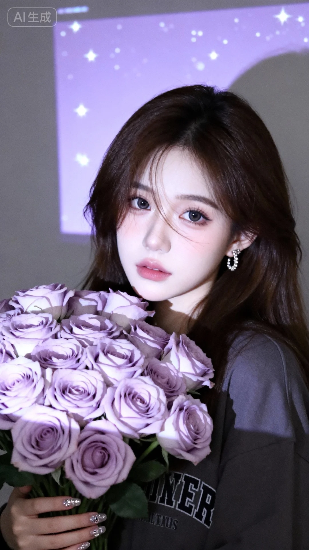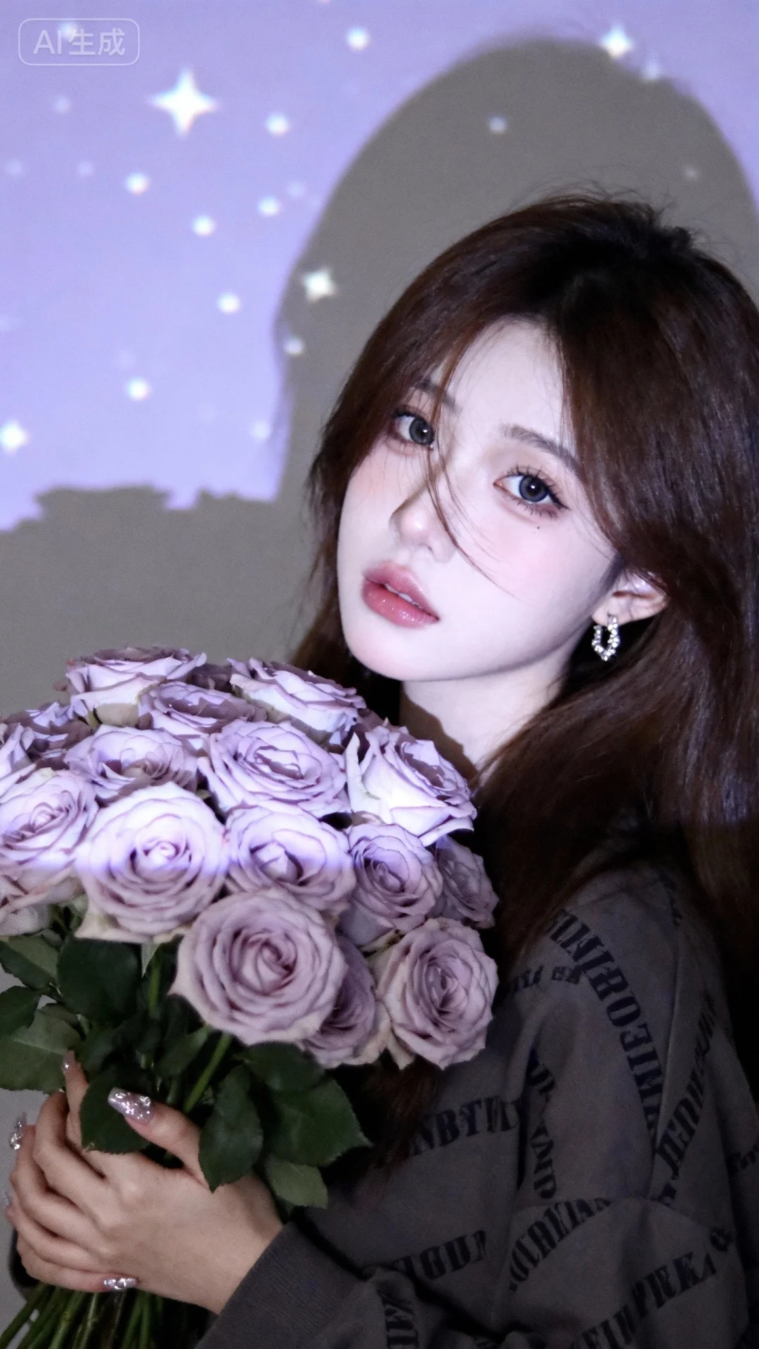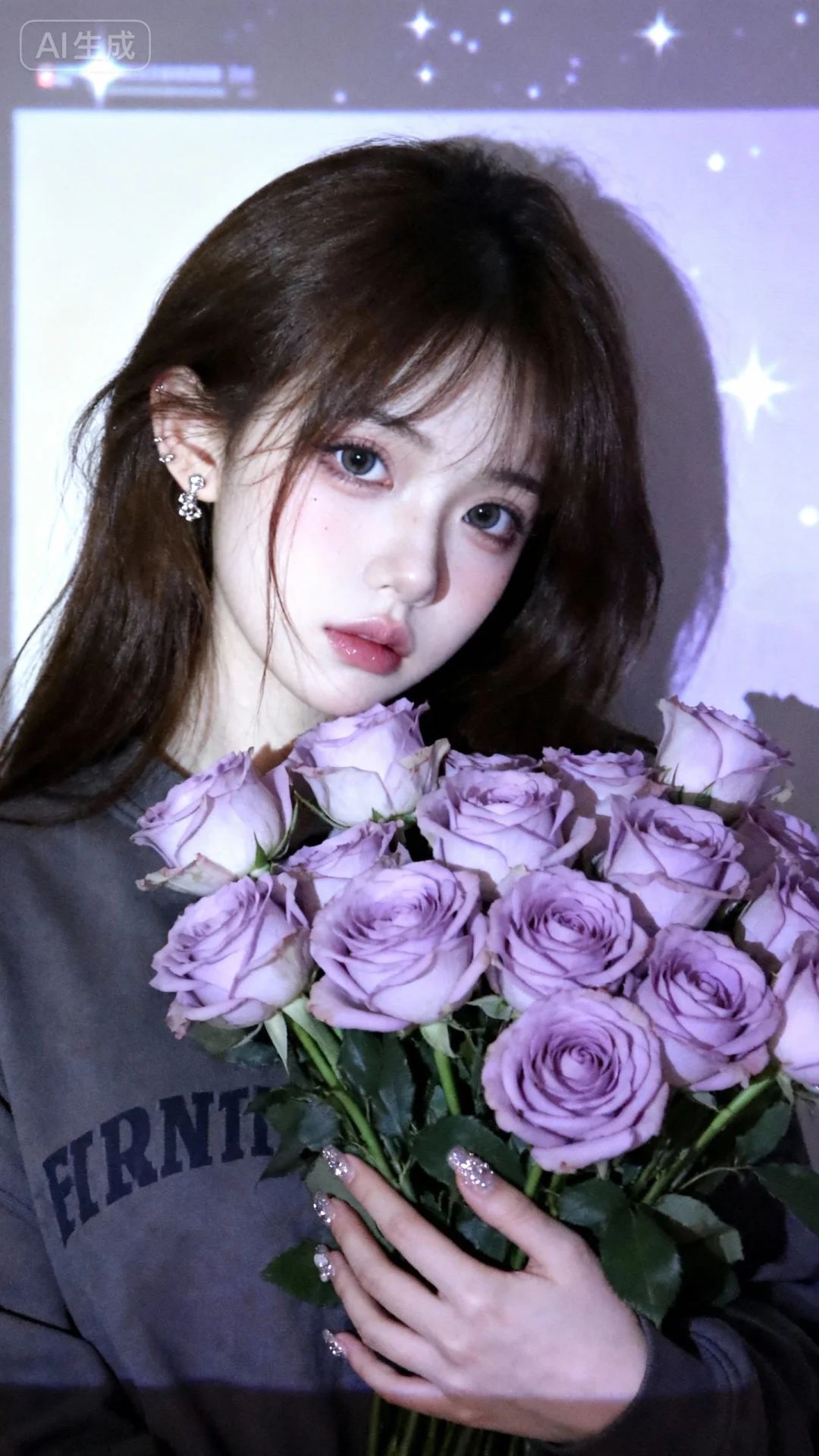 随手一拍的快照,低像素,胶片,氛围感滤镜,网感头像,整体色调低饱和莫兰迪,这张充满氛围感的照片以投影仪投射的浅灰紫色光影为背景,疏落的星点与柔润光晕交织出如暗夜柔光般的梦幻效果,画面中央一位年轻女子手持巨大束低饱和浅紫色玫瑰,超高颜值美少女,网感头像,冷白皮,瓷白肌肤、奶油白肌肤,无辜大眼睛,微醺,自然松弛,网感妆,自然光线,暖调滤镜,少女感网拍,概念风美学,情绪氛围感,聚焦眼睛,慵懒氛围感,脸部轻微曝光,像洋娃娃一样可爱,独特韵味的美,亮晶晶耳饰,亮晶晶美甲,可爱表情,深棕色唯美长发,发丝轻抚脸颊,随手一拍、抓拍,情绪具象、意境优先、氛围感主导,氛围感美学,柔焦朦胧、光影氛围感、低饱和氛围感、松弛慵懒感,身着印有英文字母的深炭灰色衣物,柔和光线从左侧映亮她沉静的面容与怀中的花束,在柔调的灰紫色光影中勾勒出静谧而富有层次的艺术感画面。