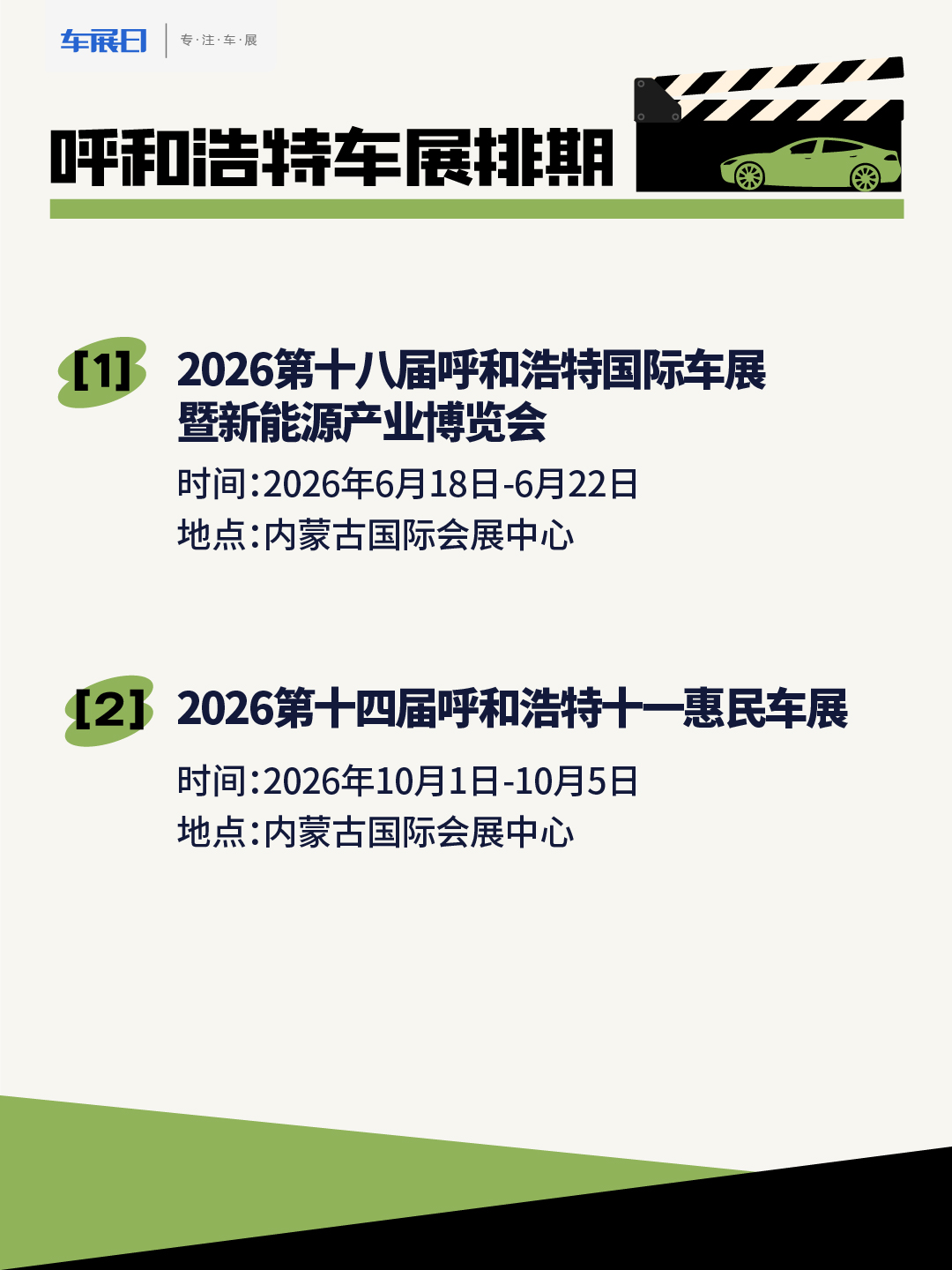2026年呼和浩特将举办多场车展,目前定档的呼和浩特车展有两场,举办地点都在内蒙古国际会展中心,第十八届呼和浩特国际车展将于6月18日至22日举办,呼和浩特十一车展的举办时间是10月1日至5日。更多车展精彩尽在车展日!