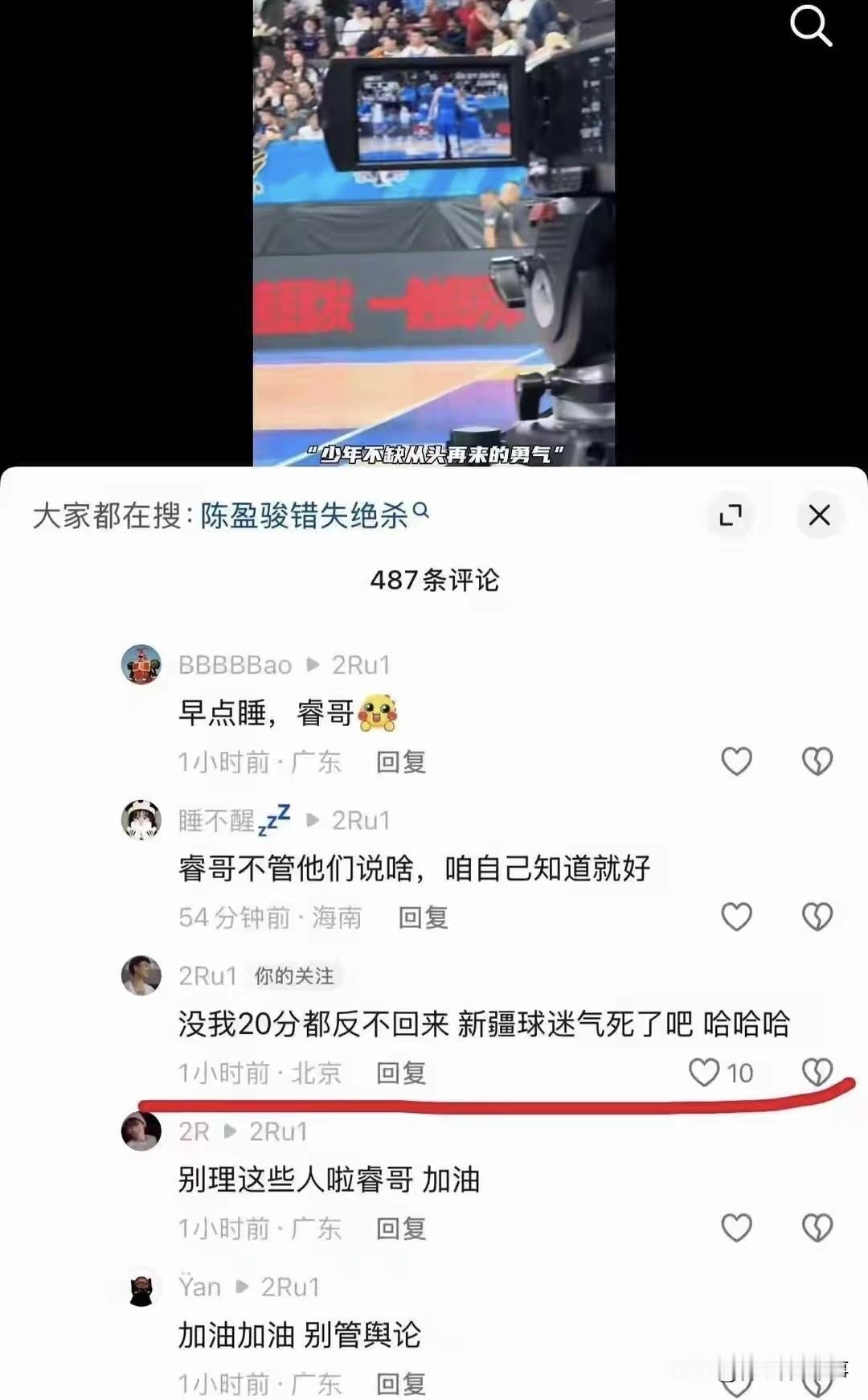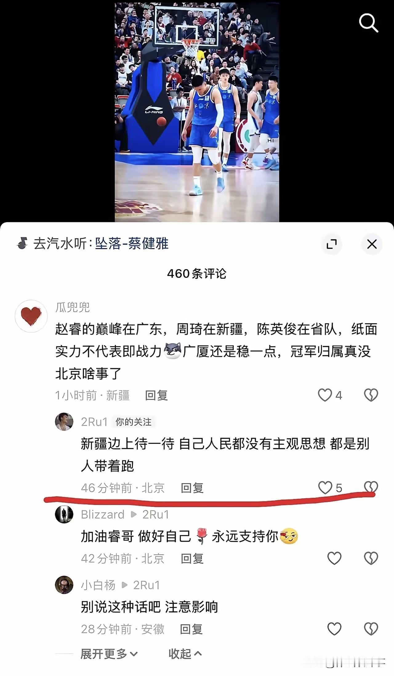 赵睿还是那个赵睿,脾气一点都没改,昨晚的比赛赵睿罚球不进错失扳平比分的机会,赛后评论区被部分球迷冲了,赵睿直接回怼新疆球迷,看来双方合作得并不愉快。 新疆球迷:赵睿的巅峰在广东,周琦在新疆,陈盈骏在省队,纸面实力不代表即战力,广厦还是稳一点,冠军归属真没北京啥事了。 赵睿:新疆边上待一待,自己人民都没有主观思想,都是别人带着跑。 新疆球迷:他是不是很生气赵睿两罚不中。 赵睿:回去打馕吧。没有我20分都返不回来,新疆球迷气死了吧,哈哈哈。 赵睿这次评论区不当言论可能会影响很大,评论区和球迷互怼,有可能要被篮协处罚了。赵睿 陈盈骏错失绝杀