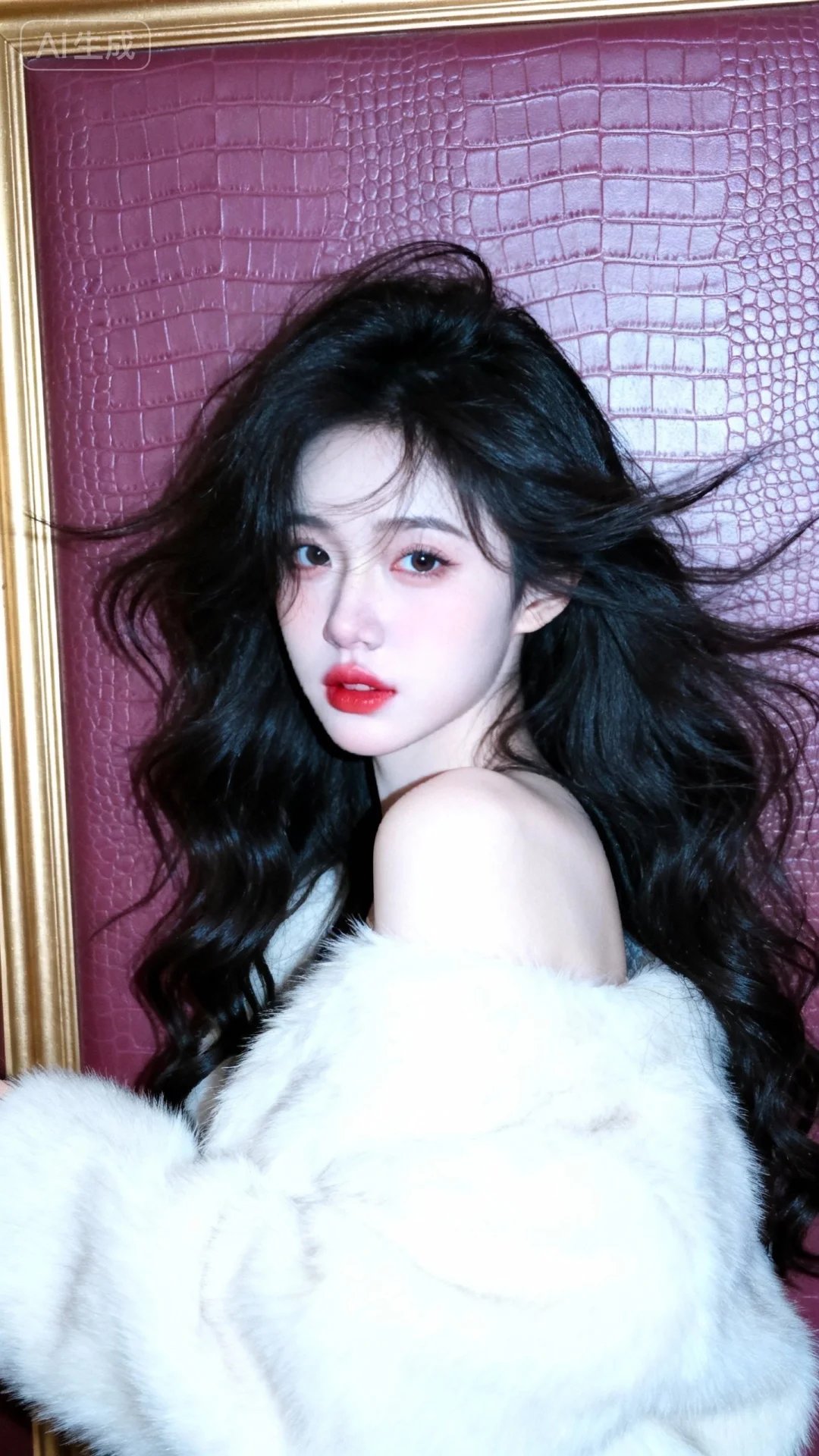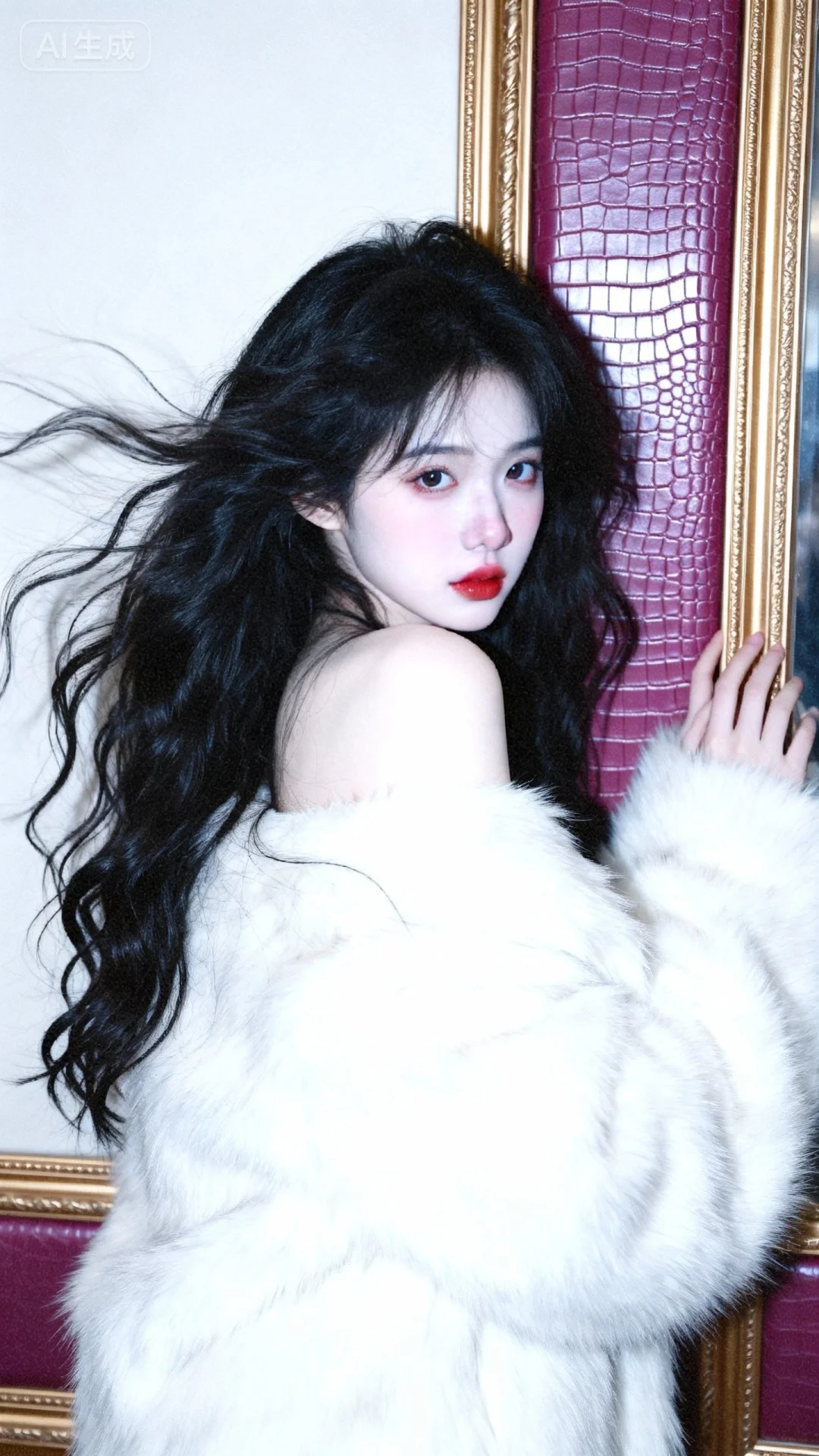 画面展现出INS风与复古感,以写真摄影风格为基础,画质超高且带有低像素、高噪点、胶片粗颗粒质感,呈现出古早味与网感的女性人像。一位中国年轻的黑色长发女性,身着白色毛绒皮草外套露肩,拥有精致的五官、楚楚可怜的神态、面色红润的冷白皮。脸部皮肤超白剔透,她的黑色长发有些凌乱,弯曲长发丝飘逸美,发丝根根分明,有着优美的柔软弧度,摆着俏皮可爱的姿势。背景是靠着浅紫红色鳄鱼皮多块软包金色边框墙面通过动态视角营造出充满故事感且带阴郁病娇氛围的画面。自然光线的漫射光洒在她脸上,光感朦胧,面部明亮,妆容自然且精致,尽显纯欲与慵懒迷人的超高颜值美女情绪氛围感。采用超高清的平庸iPhone快照风格,带动态模糊自然抓拍,有着极其平凡无奇且刻意的平庸感,如同不经意间用手机随手拍下的照片,大师构图使人物主体明亮,同时营造出柔和朦胧、细节丰富的氛围,兼具动态美学、朦胧美学,写意又前卫艺术的杰作。