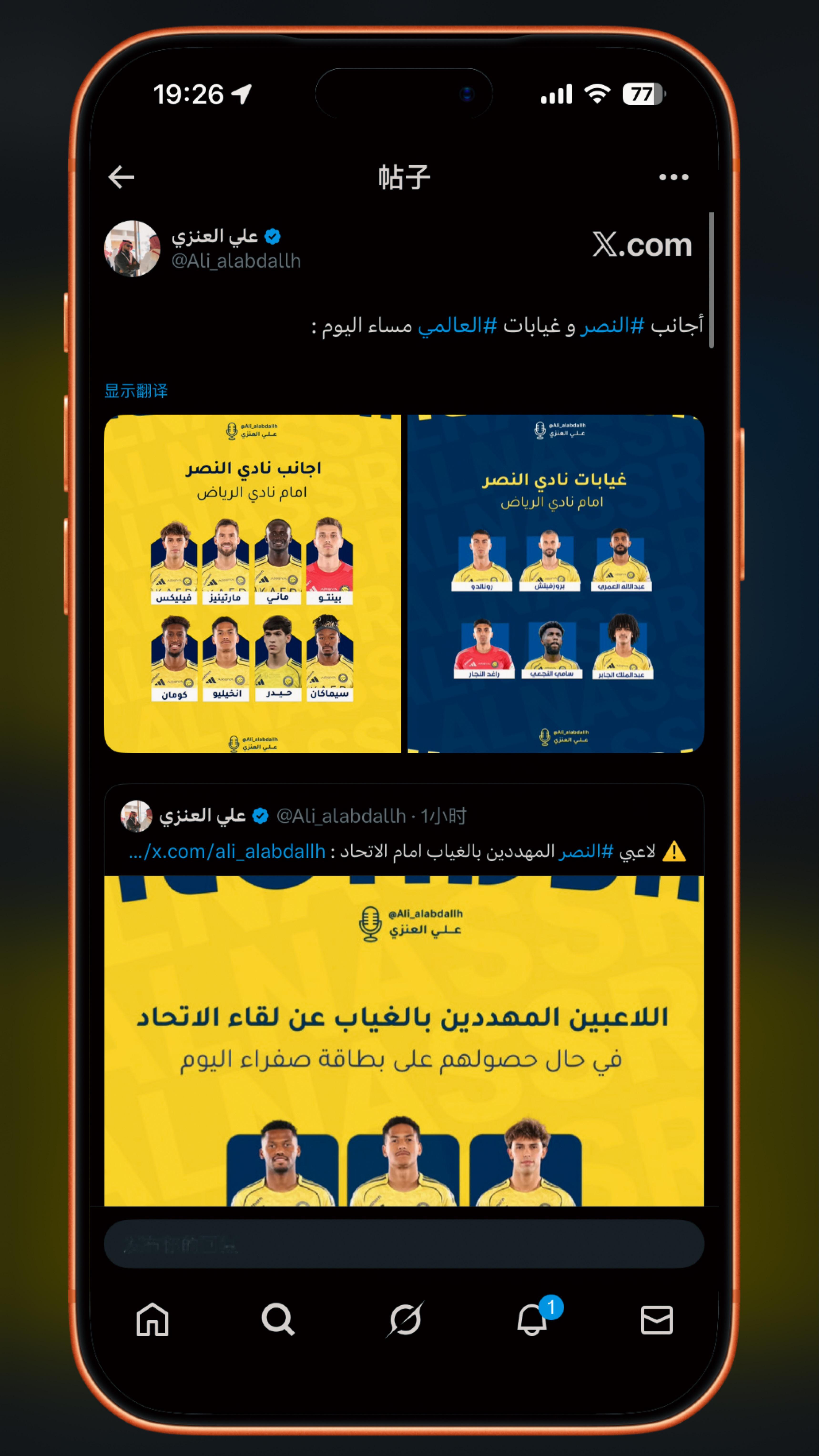 🔷 记者Ali_alabdallh表示,C罗没有入选利雅得胜利今晚的比赛名单。并且重申是官方消息:»主帅热苏斯让他进行轮休,反驳了C罗罢赛的不实消息,同时今晚比赛的缺席名单也被公布。 专栏 · C罗时刻❷