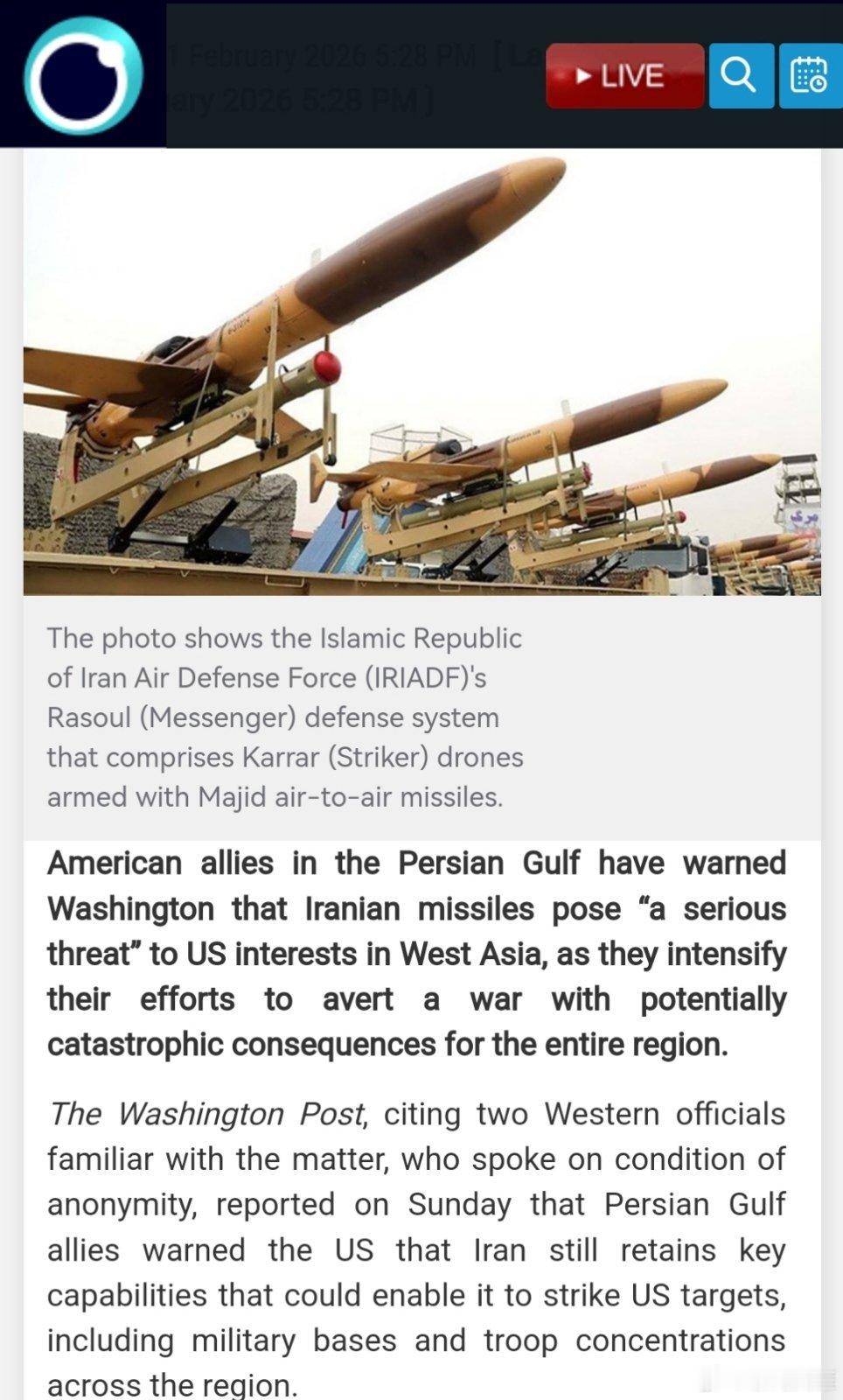 《华盛顿邮报》援引两位熟悉此事的西方官员(他们要求匿名)的言论于周日报道称,波斯湾地区的盟友警告美国,伊朗仍拥有关键的作战能力,能够对美国的目标发动攻击,包括该地区的军事基地和兵力集结点。