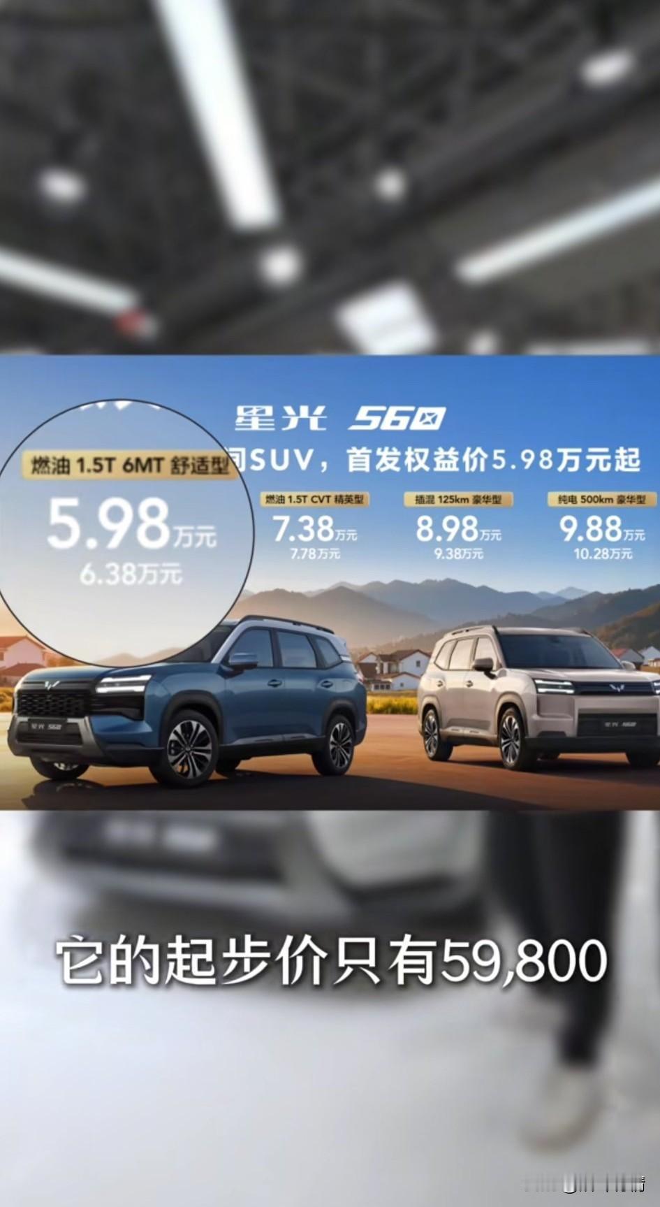 论斤卖的SUV你见过吗? 五菱星光560震撼来袭, 最便宜的燃油车1.5t版本的只需要5.98万,这样的SUV居然可以卖的这么便宜, 可以说是10万以内最便宜的SUV了, 简直不敢让人相信, 他的前脸非常的大气, 车身4m多,车高也非常的舒适, 这样一款车看起来完全不像一个小厂, 五菱真的是给人太多的惊喜了, 它的车身宽度1.4米多, 车身4.74米长, 这样的车体不会小, 同等价位的都用十八九万, 而五菱星光560只需要六七万就可以了, 这样的车真的看起来非常的霸气, 关键他的后排座椅还非常的宽, 车身后面的后备箱简直太大… 这样的车开着绝对很舒适, 大家觉得五菱星光 560这车是不是很划算?