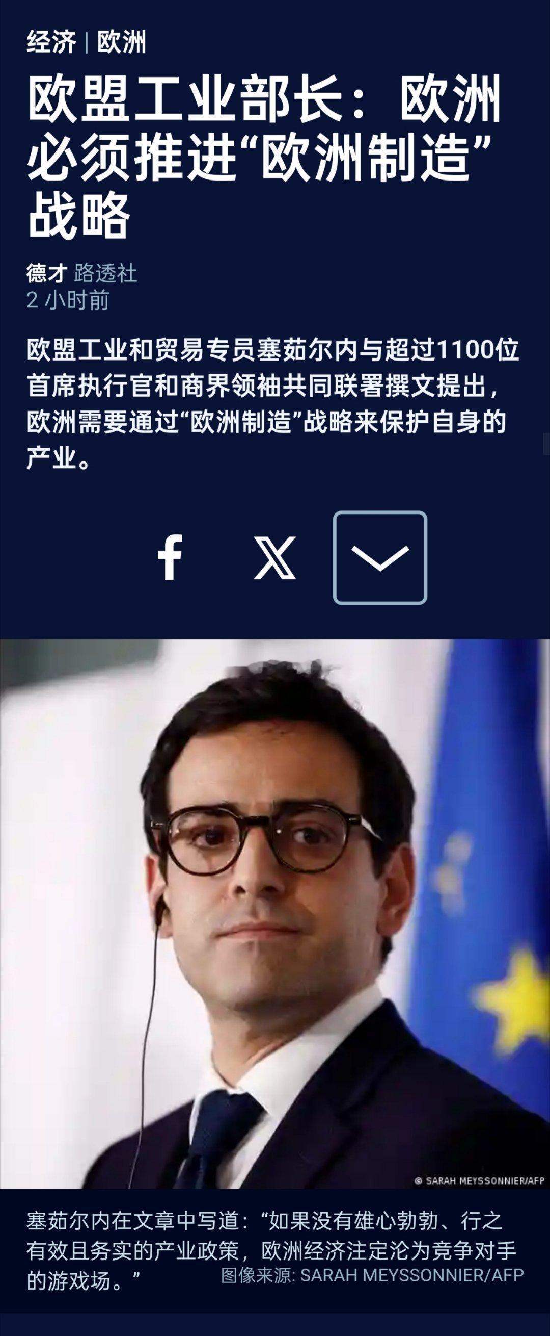 欧盟工业和贸易专员塞茹尔内在欧洲多家报纸上发表的一篇文章中指出,欧洲需要通过“欧洲制造”战略来保护自身的产业。他还表示,超过1100位首席执行官和商界领袖共同联署了这篇文章。