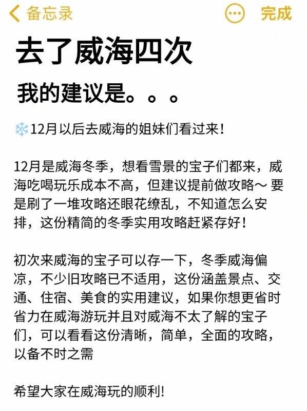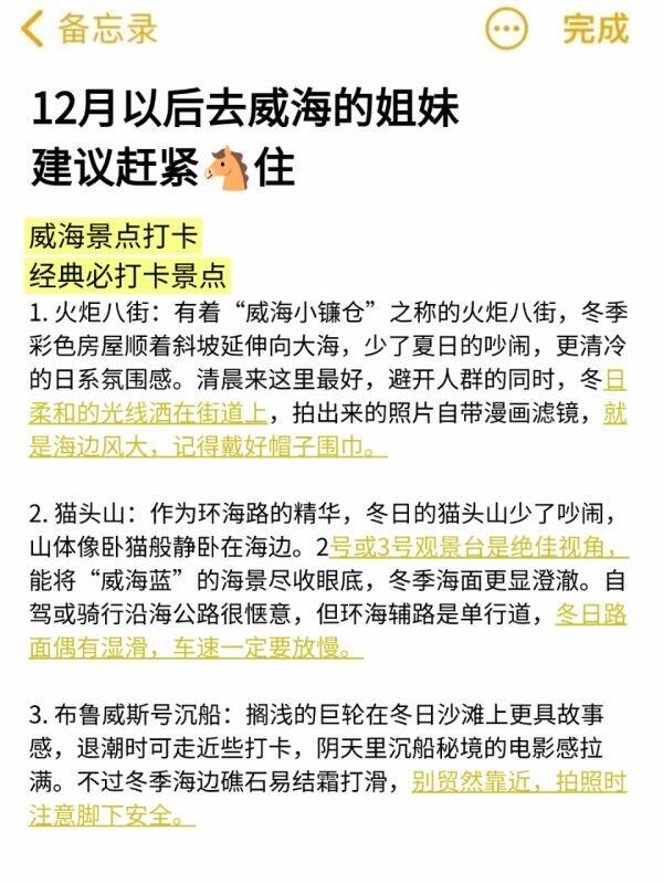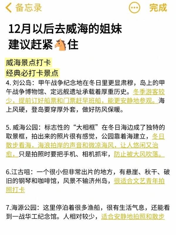 早起去猫头山⛰️,冬日环海路的风景绝了,2号观景台看威海蓝很震撼。接着去了🚢布鲁维斯号沉船,冬日的沉船更有故事感,拍照别靠近礁石,结霜打滑要注意。下午逛海源公园,渔船和纪念馆很有氛围,安静散步超舒服,傍晚返程,冬天的威海冷是冷,却有不一样的美❄️