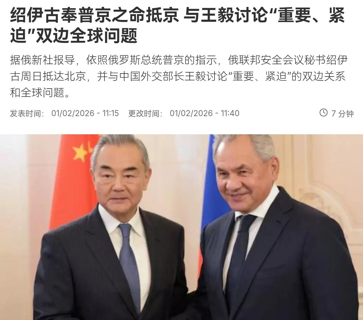 中俄双方谈妥了!普京总统亲自下令,绍伊古奉普京之命抵京,俄方定调与中国外交部长王毅讨论重要、紧迫的双边关系和全球问题。在绍伊古与王毅外长会晤后,绍伊古可以带着好结果,回去复命了。中俄达成多个共识。 2026年刚开年,俄罗斯联邦安全会议秘书绍伊古就坐飞机直奔北京,这趟来访可不是随便走走过场,普京亲自点将,让他带着重要任务跟咱们的外交部长王毅好好聊聊。 俩人一见面,气氛热络得很,直接切入正题,聊双边合作,也聊全世界乱成一锅粥的那些事。 绍伊古落地没多久就进会场,谈完当天晚上就飞回去复命,这速度快得像打仗一样,说明事真挺急,也挺重要。 话说回来,这趟访问来得正好。2026年头两个月,国际上事一件接一件,变化快得让人眼花。 乌克兰那边仗还没停,中东局势又突然紧张起来,美国新政府上台后政策一变再变,整个世界格局晃荡得厉害。 绍伊古一上来就直说,今年开头就充满不确定,全球秩序正在大洗牌,好多大事挤在短时间里爆出来,以前可能得拖一年半载才冒头,现在几个月就全来了。 大家心里都门清,这些动荡直接戳到中俄俩大国的痛点,谁都想站稳脚跟,不被别人牵着鼻子走。 王毅接话说得痛快,咱们跟莫斯科得一起发力,推真正的多边主义,把联合国这面大旗扛稳了,别让世界滑向谁拳头大谁说了算的老路。 俩人你一句我一句,聊得特别投机,没点名批评谁,但谁是搅局的那一位,大家心知肚明,过去几年,中俄关系本来就铁,2022年俩国元首宣布“背靠背”战略协作,没上限的那种。 2024年普京又来中国访问,中方代表也去过俄罗斯,俩人见面就握手定调子,经贸、能源、军事全线开花,现在绍伊古再来,就是把元首定的大方向落到实处。 聊到双边合作,绍伊古把话挑明,俄中之间的高水平互动,全靠平等相待、互相尊重、大家都有好处这条底线,王毅听了直点头,说2026年两国合作空间大得很,前景亮堂。 确实,中俄贸易额这些年蹭蹭往上窜,俄罗斯天然气、石油源源不断输送到中国,咱们的机电产品、消费品也大批量卖过去。 北方那条“力量之西伯利亚”天然气管道早就通气,新的合作项目还在排队上马,军事上更不用说,联合演习一年好几回,从北海到太平洋,海军陆军空军轮番练,默契越来越足。 老百姓最关心的就是稳定,有这两个大国靠在一起,能源价格稳了,饭碗端得也更牢。 台湾问题自然也摆上桌,绍伊古态度硬邦邦,重申俄罗斯始终认一个中国原则,北京政府才是代表全中国的唯一合法政府,这话说得掷地有声,直接给咱们的核心利益站台。 另外,他还特意提到日本那边军备扩张的速度让人警惕,日本这些年修宪、扩军、买美制武器一套接一套,明显想在亚太搅风搅水。 中俄在这点上看法越来越近,虽然王毅没当场多说,但咱们前阵子在东海、黄海的实际动作,已经让东京感受到压力。 绍伊古把这话带出来,等于告诉外界,中俄在地区安全上越来越同步,日本想单干,得先掂量掂量后果。 再往大处看,俩人重点聊了怎么在国际舞台上抱团取暖,绍伊古说,俄方愿意跟中方把外交步调踩得更准,尤其在联合国安理会、金砖国家、上合组织这些平台上多配合。 王毅回应得干脆,中俄作为大国和常任理事国,得带头把全球治理往更公平的方向推,不能让经济全球化变成少数人吃肉多数人喝汤的游戏。 现在有些势力老想搞小圈子、拉帮结派,中俄站出来喊话,就是要告诉全世界,开放合作才是正道,封闭对抗只会两败俱伤。 这趟会谈还有个背景不能忽略,就在前几天,普京在克里姆林宫刚接见过伊朗高层,中东那摊子事烧得正旺,伊朗跟某些势力的矛盾越来越尖锐。 中俄在维护地区稳定上立场一致,都不支持外部势力乱插手,绍伊古带着这份默契来北京,等于把中俄对中东、対伊朗的态度又对了一次表。 未来不管风浪多大,德黑兰知道背后有北京和莫斯科撑腰,心里就更有底。 绍伊古谈完就走,带着一堆新共识回莫斯科向普京汇报,这次速战速决的访问,传递的信号很清楚:中俄不光嘴上说说,行动上也越来越紧实。 面对外部压力,俩国选择继续抱团,把战略互信转化为实打实的合作,经贸上互补优势继续放大,安全上互相撑腰,国际事务上同进同退。 普通老百姓看这些,或许觉得离自己远,但其实关系大得很,能源稳了,物价就不容易疯涨,地区稳了,咱出门旅游、做生意也安心,世界多极化走得更稳当,咱们的声音在国际上就更有分量。 中俄这次谈得这么投机,根上还是因为两国都明白一个道理:单打独斗风险大,携手往前走才更有力量,未来不管谁想挑事,都得先想想这对“铁哥们”站在一起的分量。