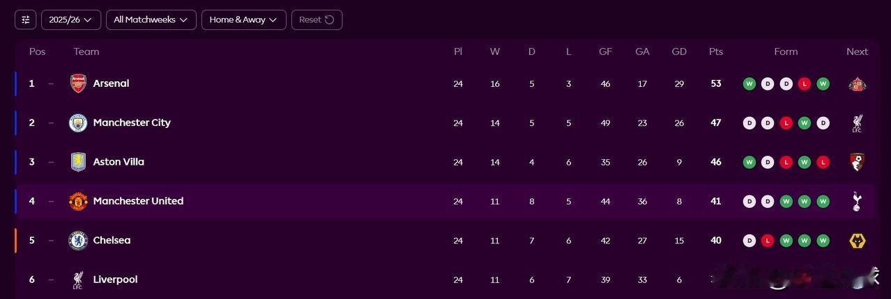 曼联在2026年2月1日的英超联赛中主场绝杀富勒姆,卡里克执教后豪取三连胜,球队重返积分榜第四位。 目前看来,赛季结束时,单线作战的他们联赛排名可能还将更进一步……. 排名第三的阿斯顿维拉将缺席关键球员如:沃特金斯、卡马拉、麦金和蒂勒曼斯——基本上未来几周他们将缺席整个中场,而下轮他们将客场挑战伯恩茅斯。 排名第二的曼城在过去6场比赛中仅胜一场——显然他们状态不佳,且下周将对阵利物浦。 曼联下周将在老特拉福德迎战热刺——他们伤病累累、状态低迷,老实说就是待宰羔羊。 这场比赛必须拿下。没有借口。这同时也是本周的第一场比赛,因此一场胜利能立即给维拉和曼城施加巨大压力。目前势头至关重要,曼联绝不能在这种比赛中丢分。 赢下比赛,他们就仅落后维拉2分、落后曼城3分……争四(甚至更高排名)希望真的来了。