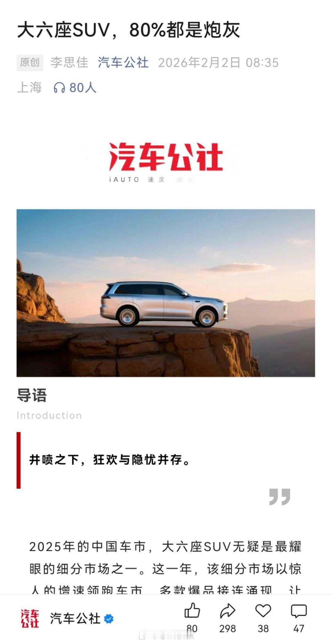 汽车公社,今早发了一篇行业观察标题为《大六座SUV,80%都是炮灰》