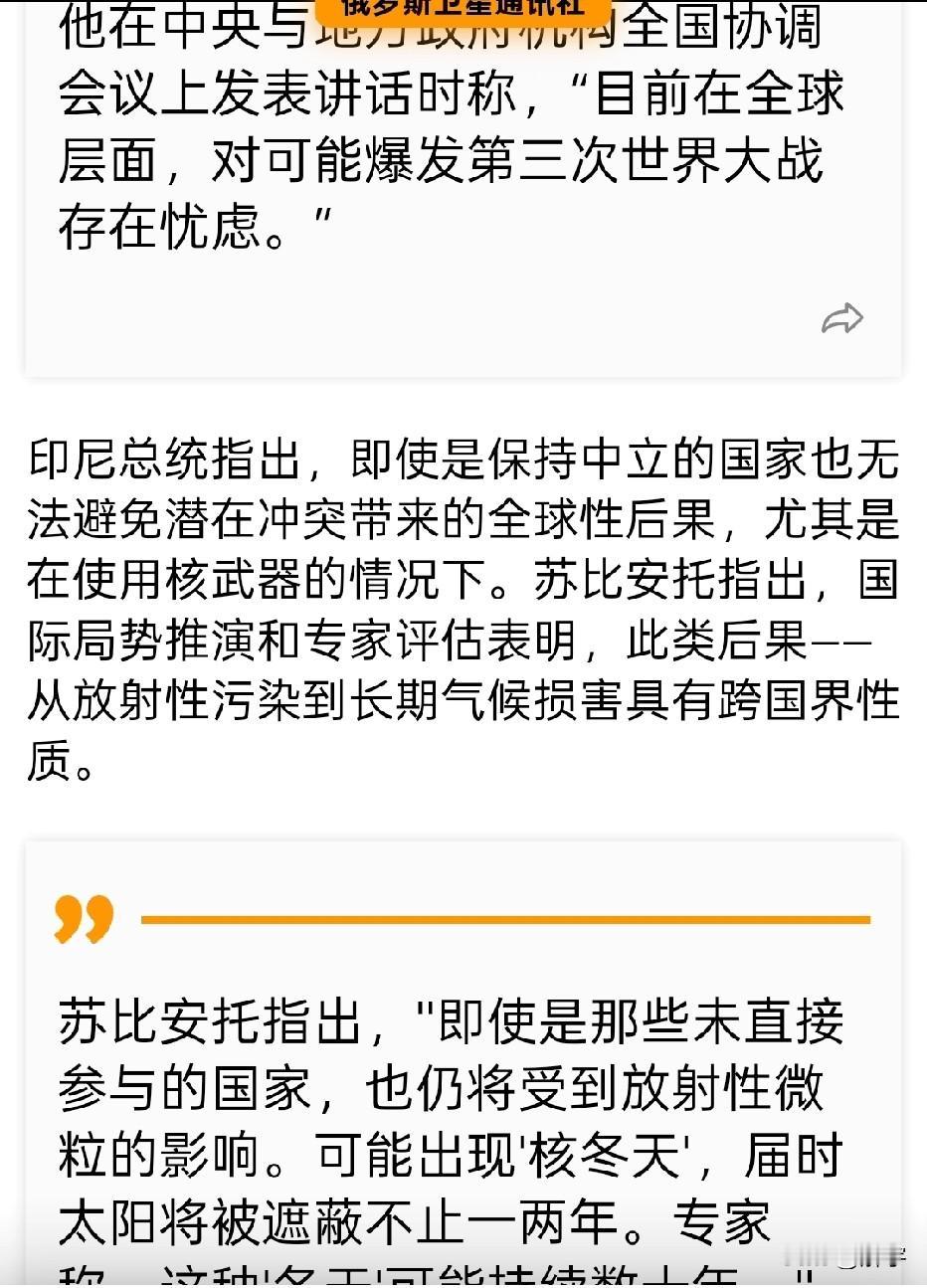 目前存在第三次世界大战风险,“核冬天”可能存在数十年! 就在当今世界此起彼伏的战乱不断出现,让世界人民惶恐不安之际,某些国家领导人终于说出了全球人民最担心出现的事情,那就是第三次世界大战的爆发,以及其产生的灾难性后果。 印度尼西亚总统在最近一次面对政府官员的公开讲话中指出,目前存在爆发第三次世界大战的风险,最为严重的是,如果在这次冲突中使用核武器,会导致全世界所有国家都遭遇“核冬天”这一灾难性后果,时间可能长达数十年(具体详情见图二)。由此可见,当今世界的紧张局势,已经让这些掌握一手资料的国家领导人感觉到了危险,已经有了重蹈前两次世界大战覆辙的征兆。遗憾的是,制造出这些紧张局势的国家,同样来自前两次世界大战的发源地西方,哪怕那种席卷全世界大部分地区的战争灾难仅仅过去数十年,他们却因为利益再次萌生了抢劫的念头,而以他们的带头人,用公然袭击委内瑞拉,控制马杜罗来昭告世界:美国开始了在国际社会抢劫资源的行动,而这,正是当今世界各国紧张的源头,是世界走向动乱的开始!这样的情况,再次证明:人类唯一能从历史中吸取的教训就是,人类从来都不会从历史中吸取教训!