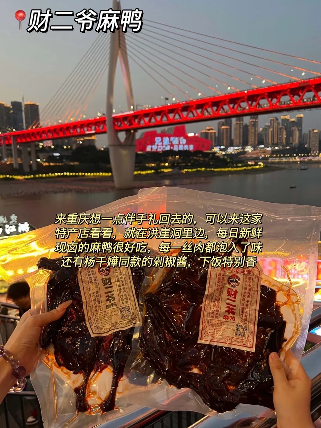 来重庆想一点伴手礼回去的,可以来这家特产店看看,就在洪崖洞里边,每日新鲜现卤的麻鸭很好吃,每一丝肉都泡入了味还有杨千同款的剁椒酱,下饭特别香