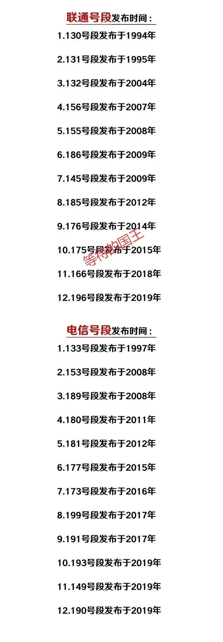 如图所示,在上个世纪90年代,移动发布了4个号段(136、137、138、139)。联通发布了2个号段(130、131)。电信号段发布了1个号段(133)。也就是说这7个号段最短也有近30年了。其他号段都是进入21世纪后才发布的。所以你的号码用了多少年了呢?有多少10年、20年都没换过号码的人,不是说不换电话号码的人有多优秀,可以肯定的是他稳重、可靠、踏实,必然是一个重感情、重亲情的人。如果大家在生活中遇到这种人,一定要交个朋友。