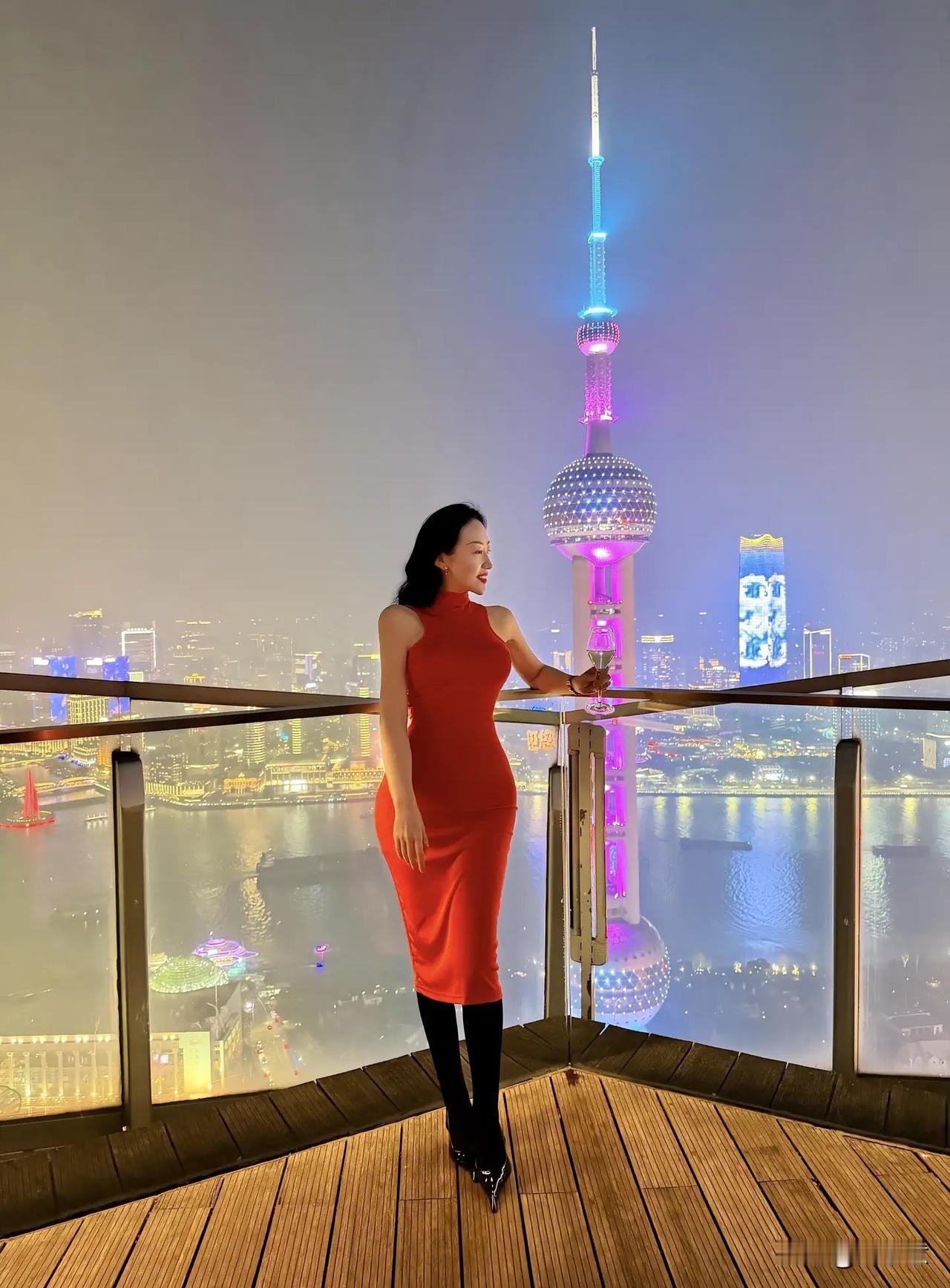 夜晚上海外滩,东方明珠塔下,红裙女子与城市夜景相映成趣。