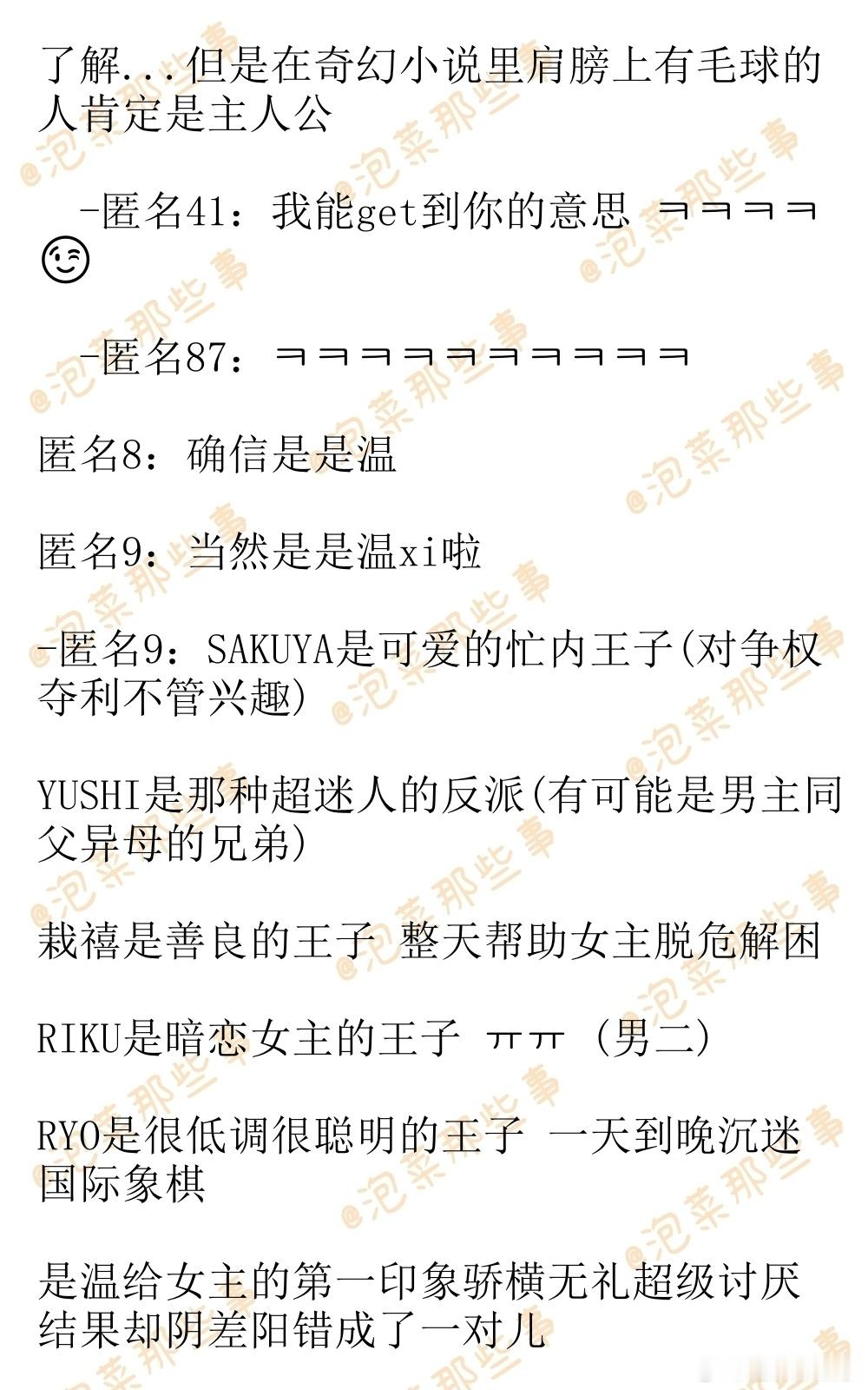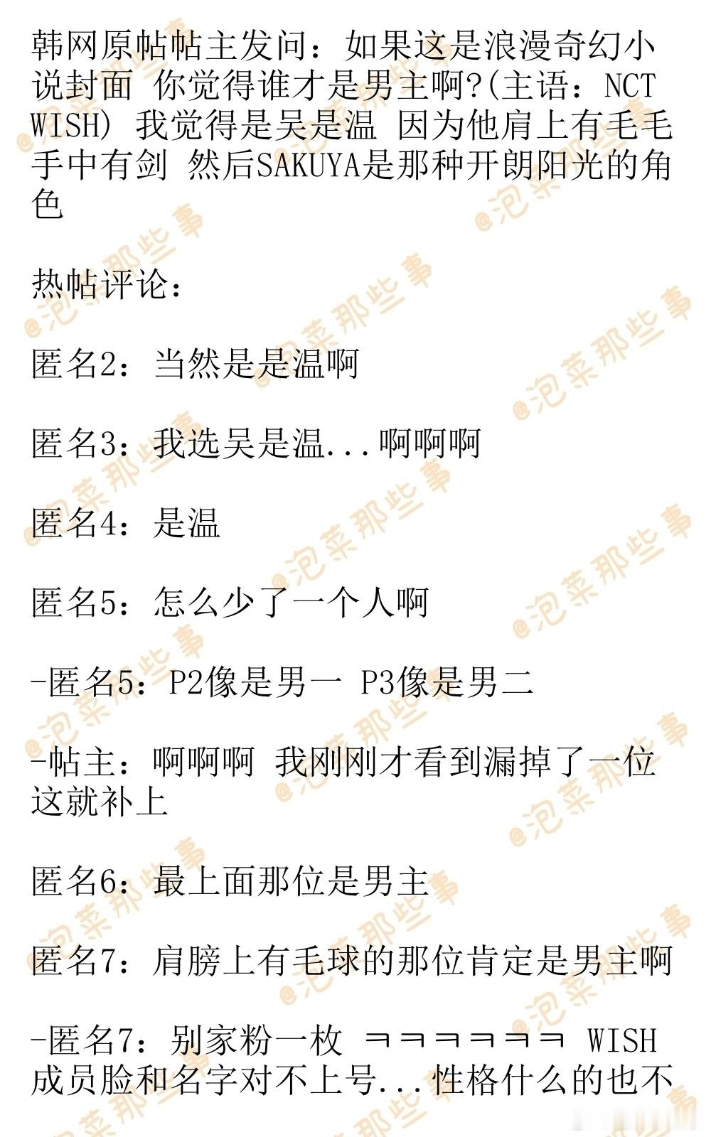 🔥韩网热帖评论翻译🔥如果这是浪漫奇幻小说你觉得谁才是男主啊?韩网原帖帖主发问:如果这是浪漫奇幻小说 你觉得谁才是男主啊?(主语:NCT WISH) 我觉得是吴是温 因为他肩上有毛毛 手中有剑 然后SAKUYA是那种开朗阳光的角色cr.instiz