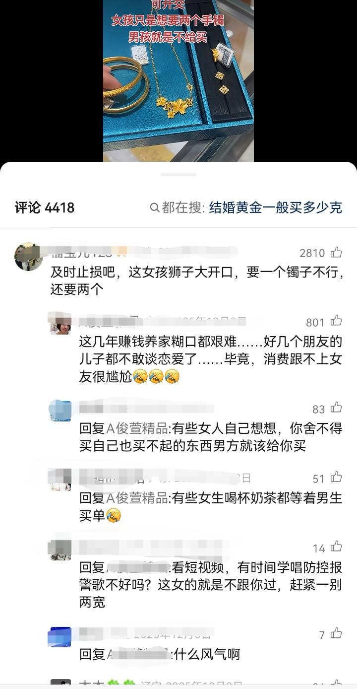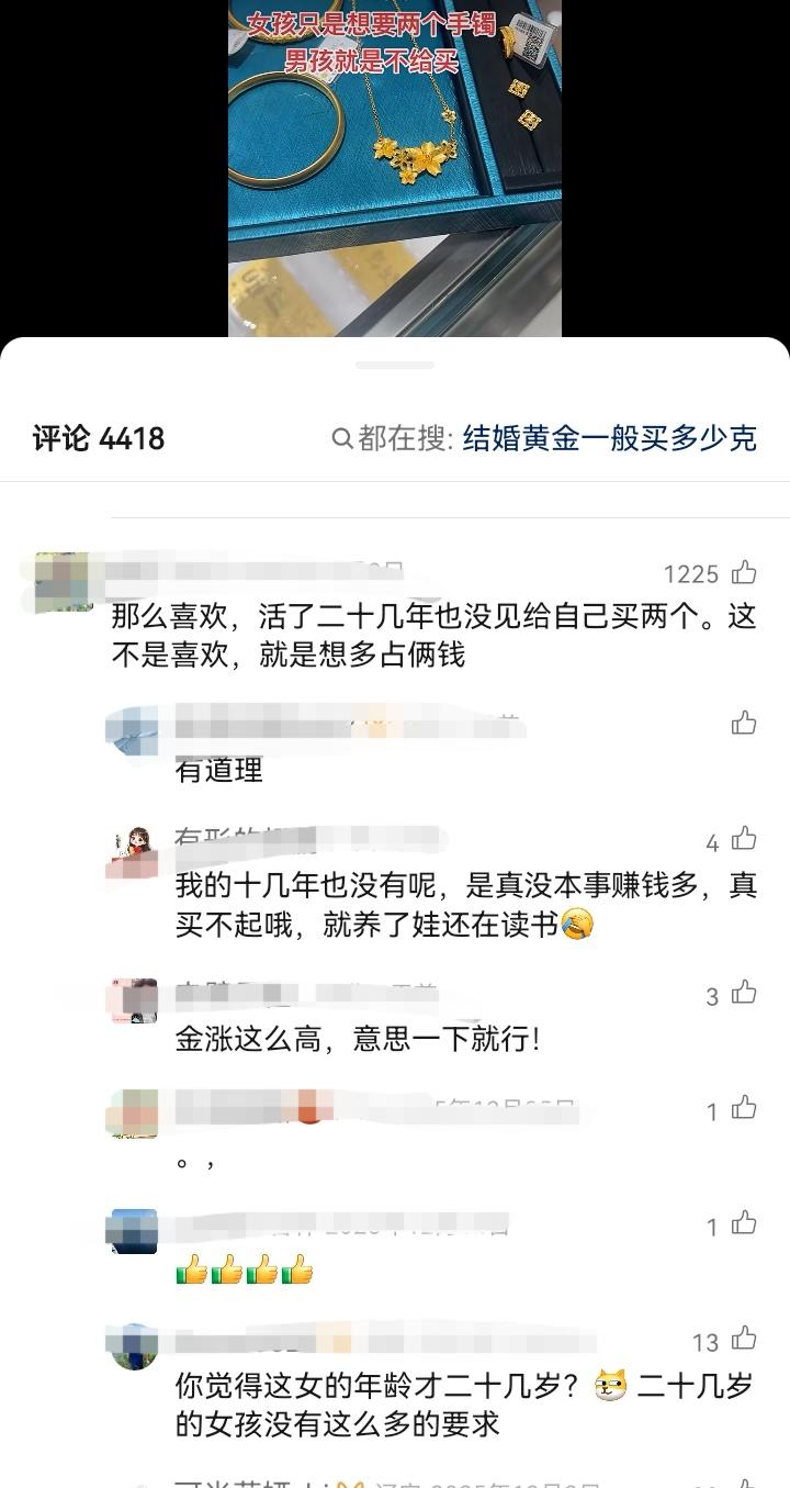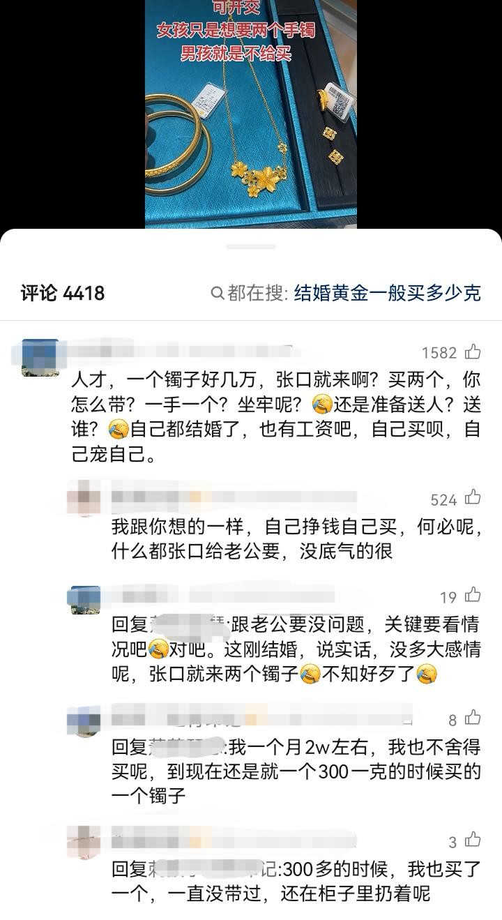发现还是三个观正的人比较多的——有人发视频抱怨:“本来结婚是多喜庆的事,为了一个金手镯闹得不可开交,女孩只是想要两个手镯,男孩就是不给买” 估计博主想要得到网友的支持,结果支持她的甚少,大部分网友都觉得这个女孩是利用婚姻敛财,现在金价居高不下,还故意要大克重的金饰,确实让人觉得居心不良,不少人觉得男方应该及时止损,友友们怎么看?