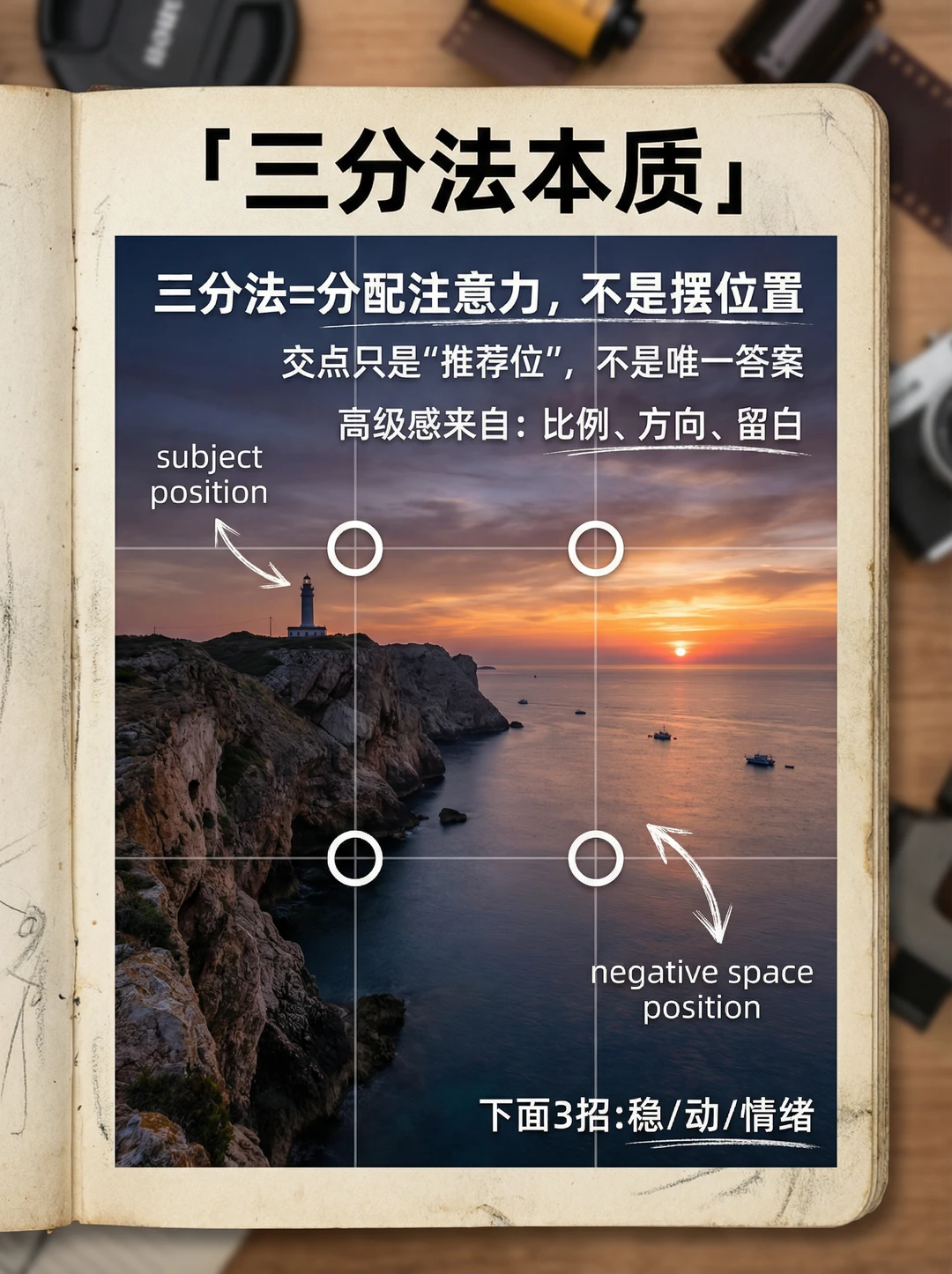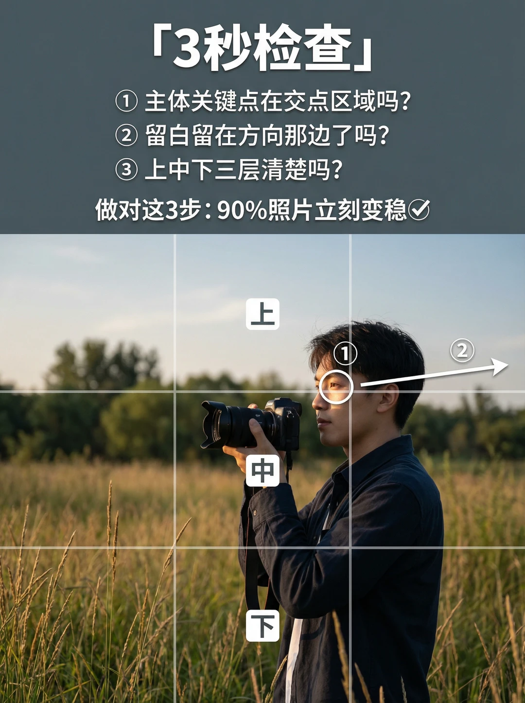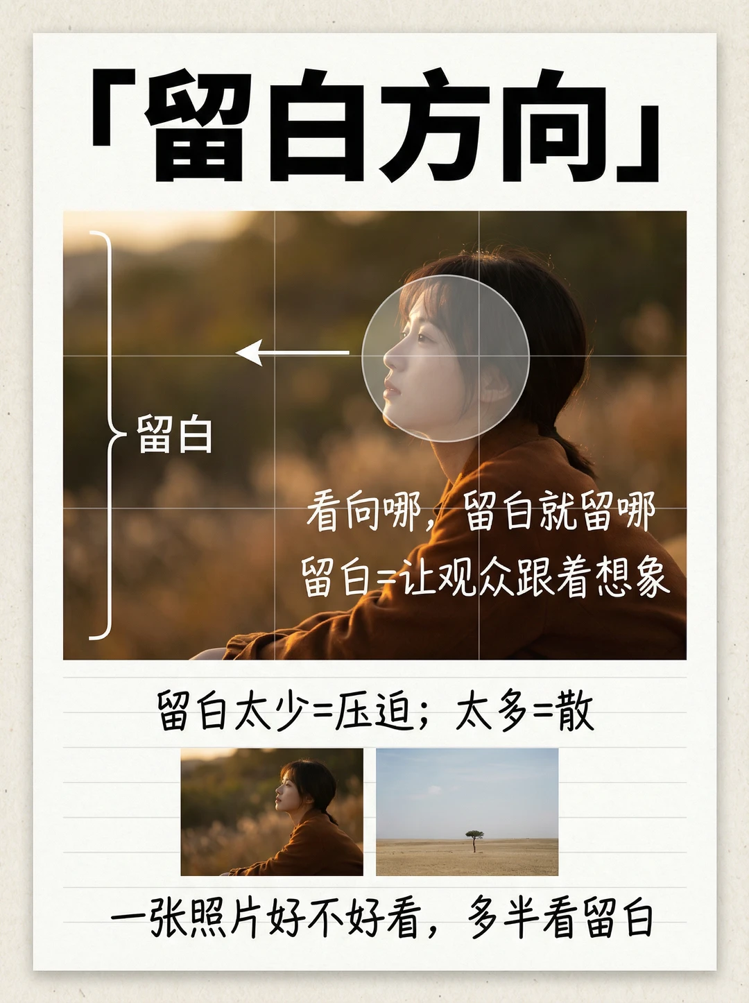 你有没有遇到这种情况👇 📸 明明按“三分法”把人放在交点了,照片还是僵、别扭、不耐看? 别急,这不是你没审美,是你只学了“三分法的皮”😩 这期我把三分法讲透成3种高级用法✨ ✅ ① 交点不是“点”,而是一块交点区域(更自然不死板) ✅ ② 三分看的是方向感:人物看向哪,留白就留哪(故事感立刻有) ✅ ③ 三分还能用来做三层分配:上氛围/中主体/下支撑(画面瞬间更稳) 我做成了【8页可抄作业】📚 你拿任意照片都能套用:街拍/人像/旅行/产品都适用。