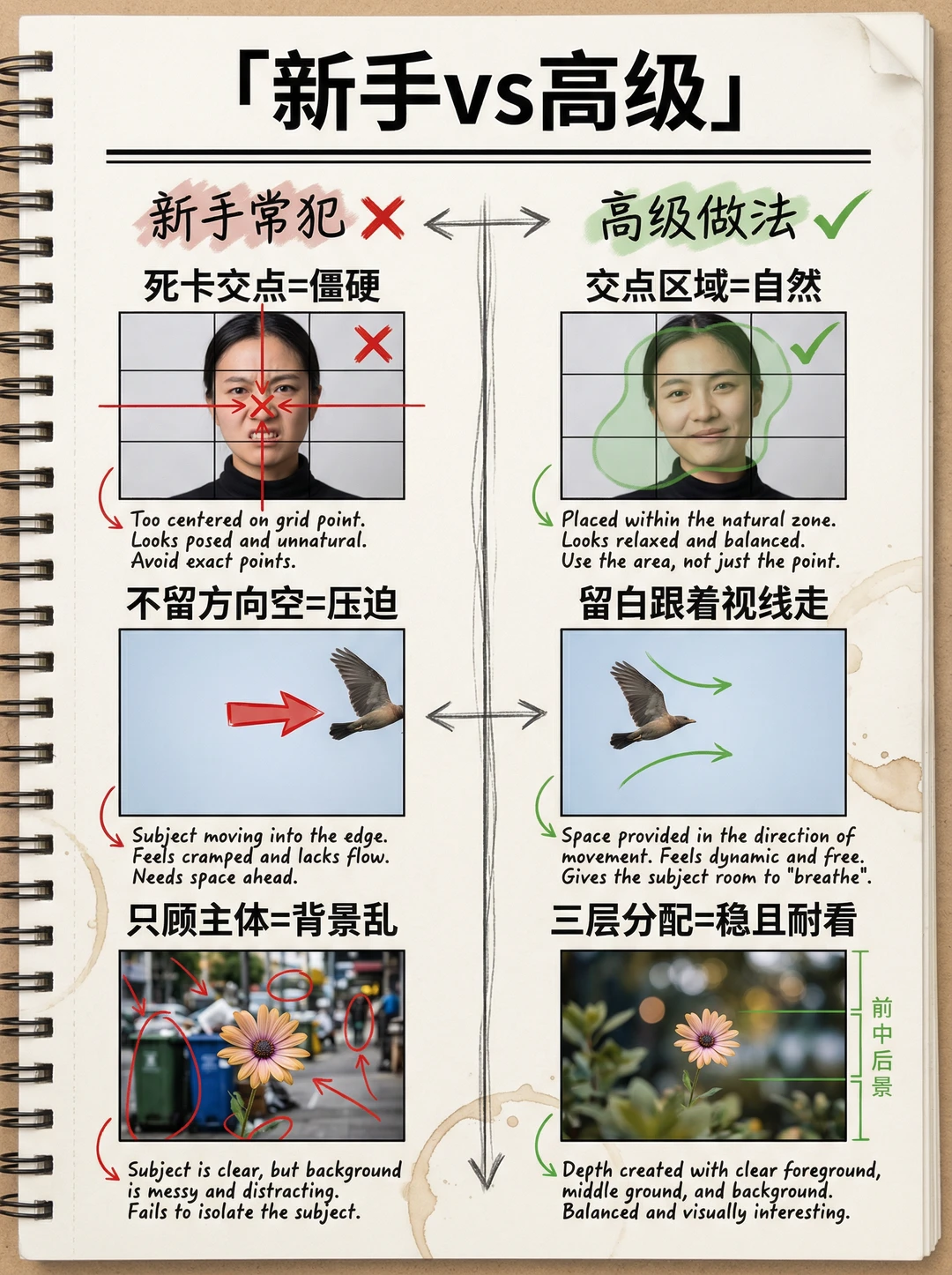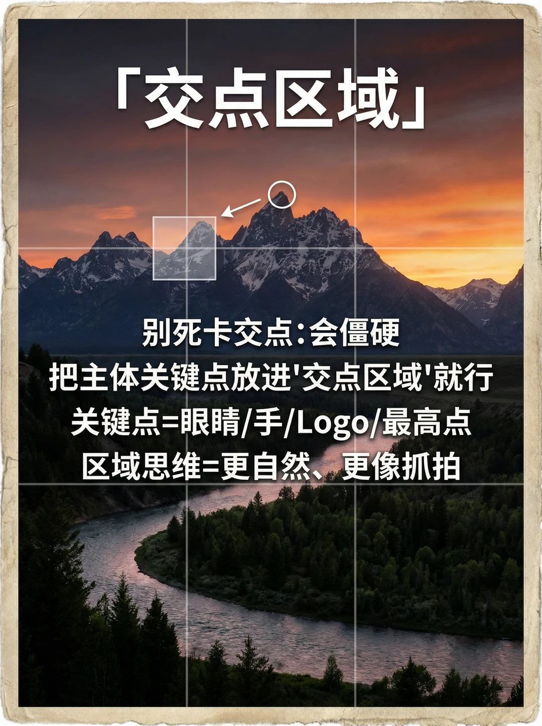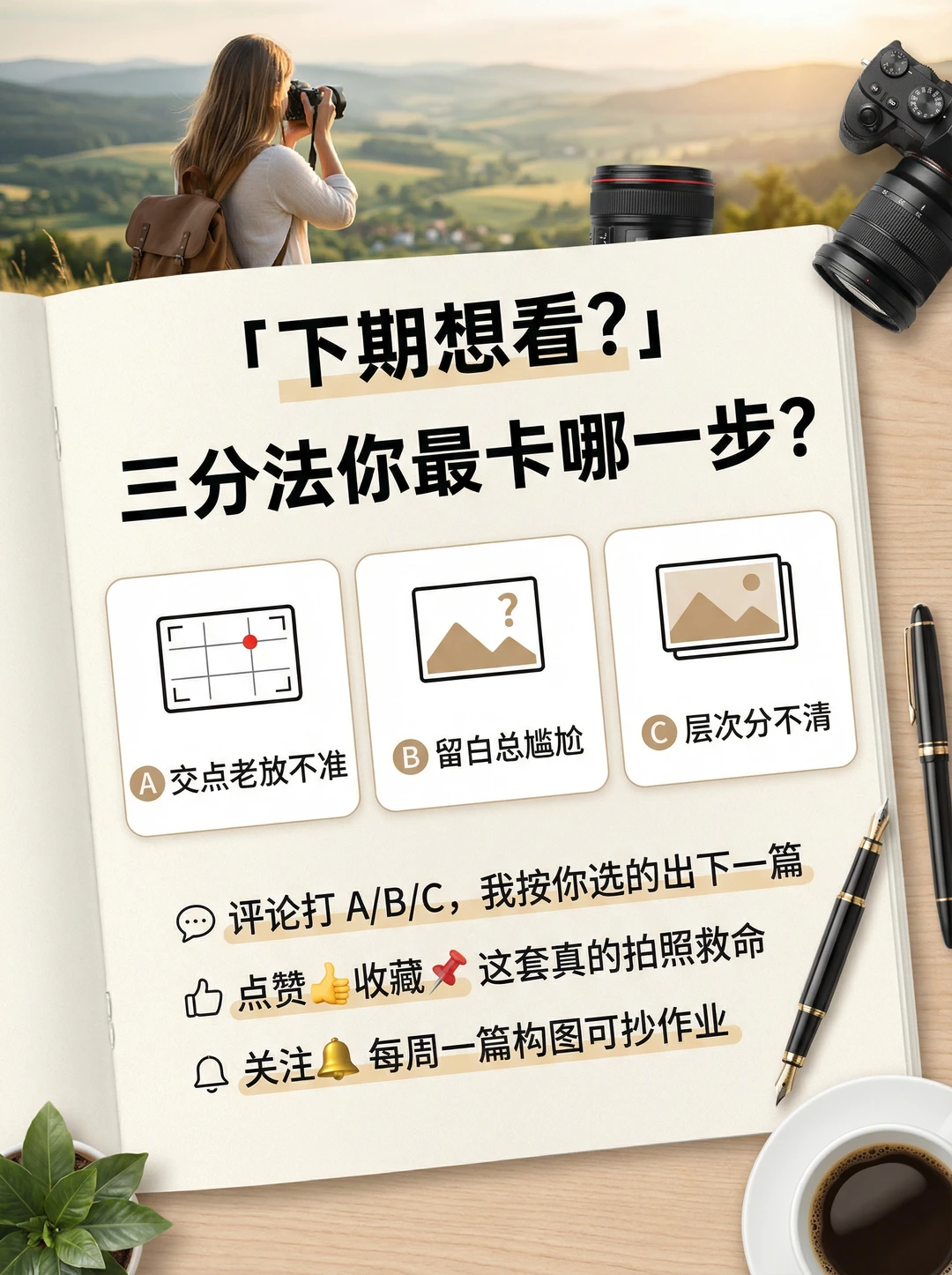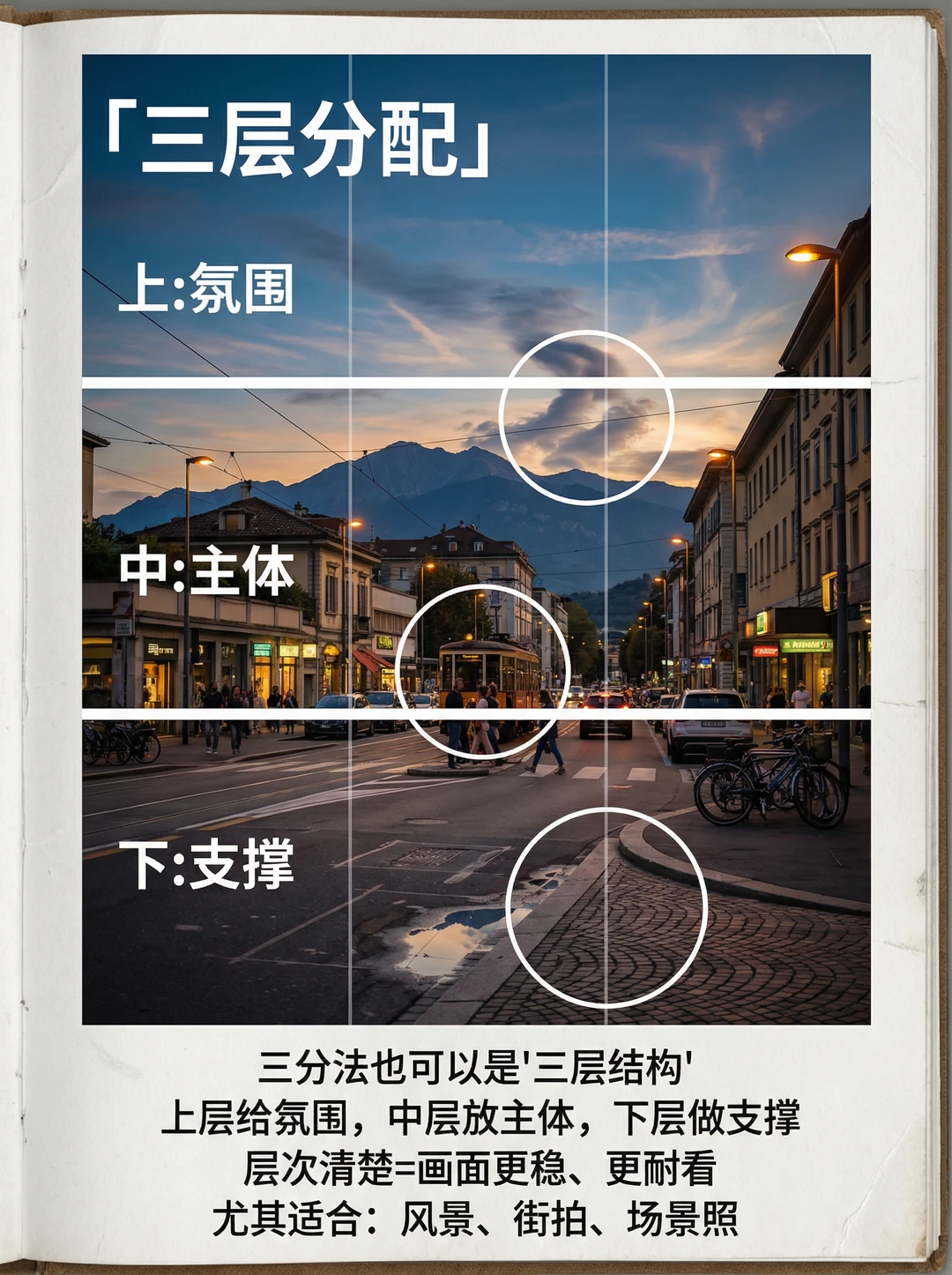 你有没有遇到这种情况👇 📸 明明按“三分法”把人放在交点了,照片还是僵、别扭、不耐看? 别急,这不是你没审美,是你只学了“三分法的皮”😩 这期我把三分法讲透成3种高级用法✨ ✅ ① 交点不是“点”,而是一块交点区域(更自然不死板) ✅ ② 三分看的是方向感:人物看向哪,留白就留哪(故事感立刻有) ✅ ③ 三分还能用来做三层分配:上氛围/中主体/下支撑(画面瞬间更稳) 我做成了【8页可抄作业】📚 你拿任意照片都能套用:街拍/人像/旅行/产品都适用。