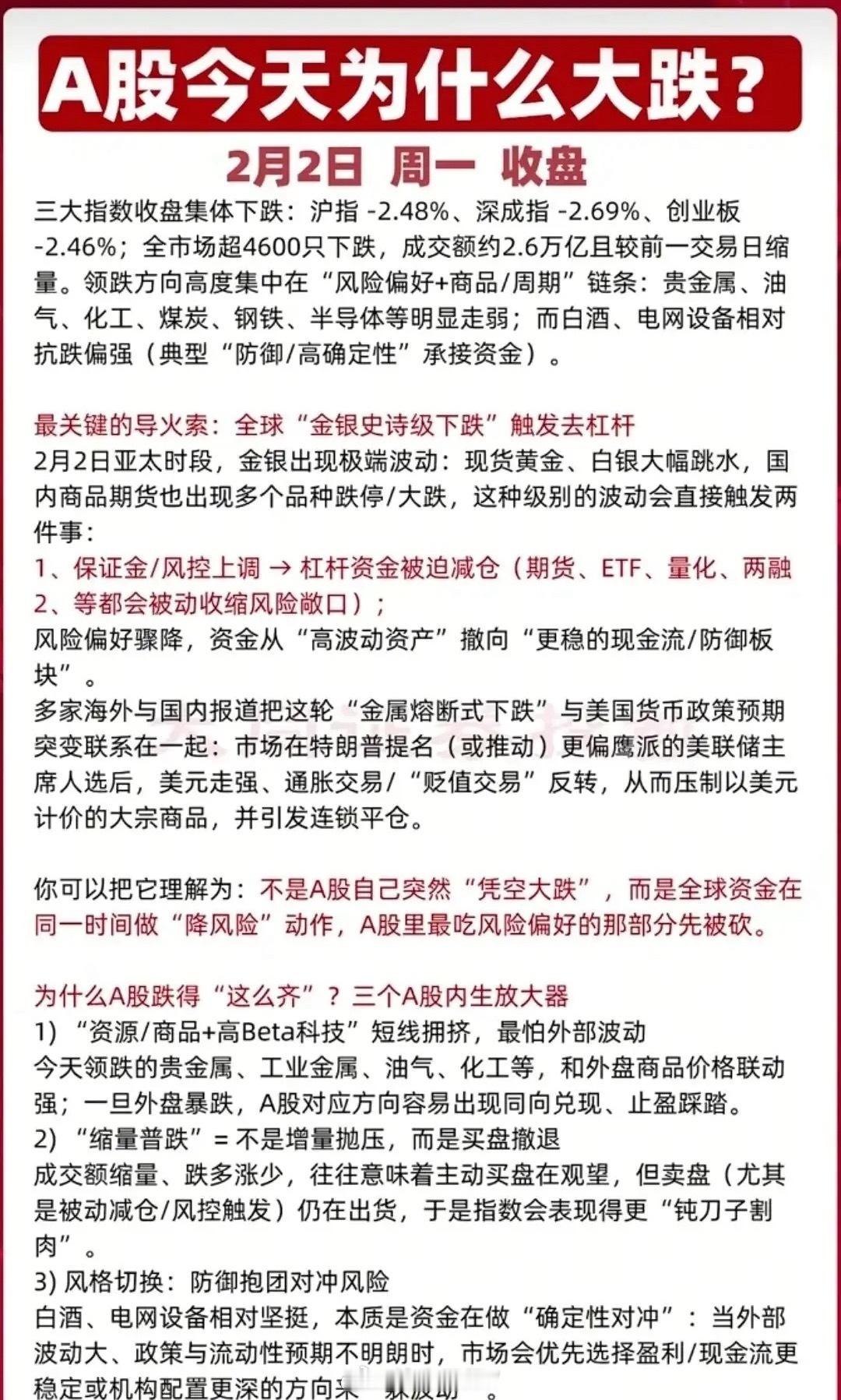 2月2日A股大跌的原因找到了,主力资金流入流出哪些板块?游资大佬买入卖出哪些个股?A股今天这波大跌,是全球资本“降风险”动作的连锁反应!贵金属史诗级跳水触发去杠杆,高波动资产集体承压,资金慌忙扑向白酒、电网等防御板块避险。2月2日主力与游资资金动向出炉,主力在电网设备、白酒等板块抢筹,中超控股、贵州茅台获大额净流入,同时在通信设备、AI应用等板块出逃,中际旭创、蓝色光标资金流出居前。游资龙虎榜中,章盟主、作手新一、成都系等活跃资金在黄河旋风、通鼎互联、保变电气等标的上激烈博弈,机构与拉萨天团也在各自布局。资金的攻守之间,藏着市场当下的温度与情绪。理财有风险投资需谨慎,资料取材网络仅供参考不能作为投资依据。